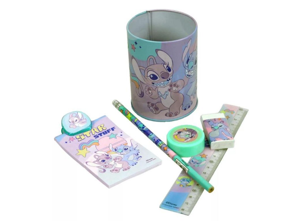 7 - dílná psací souprava Lilo a Stitch. Rozměry: 18 cm x 7 cm. Obsahuje: zápisník, klip, pravítko, ořezávátko, gumu, tužku a stojánek. Oficiální licence, Gimsa.Doplňkové parametry