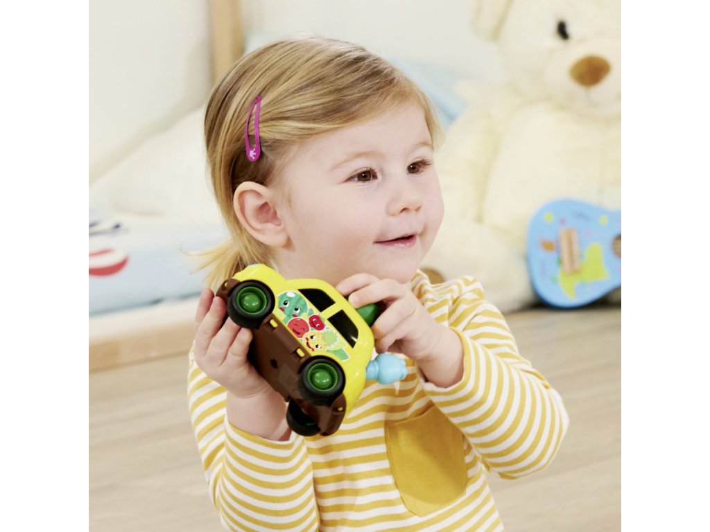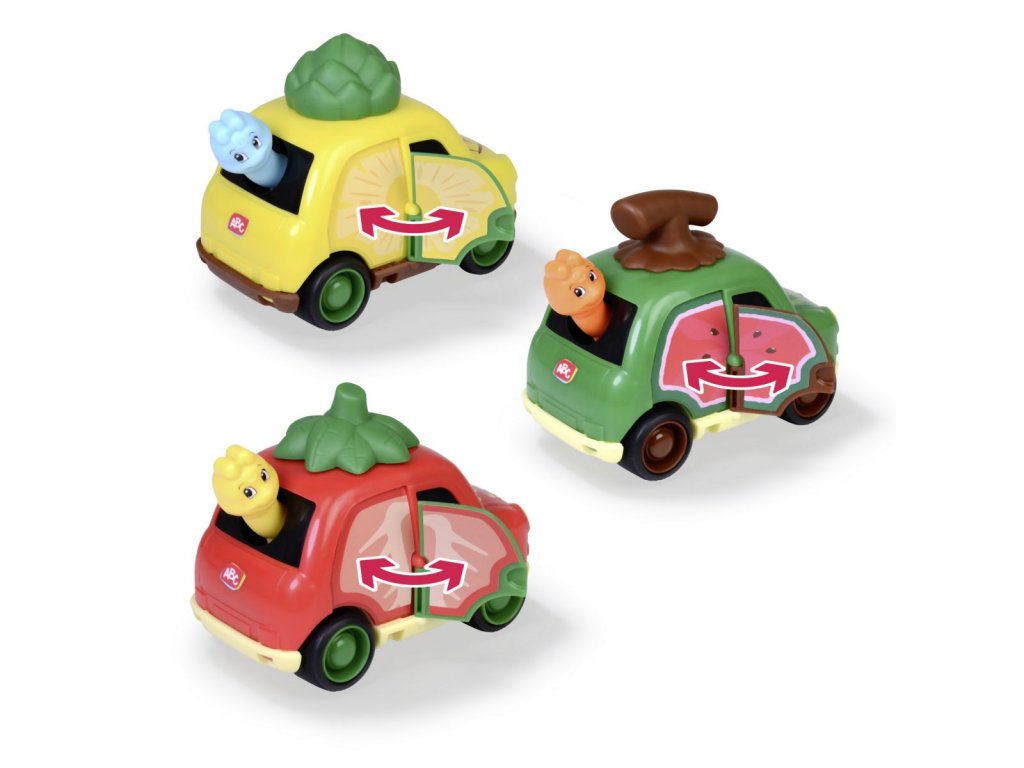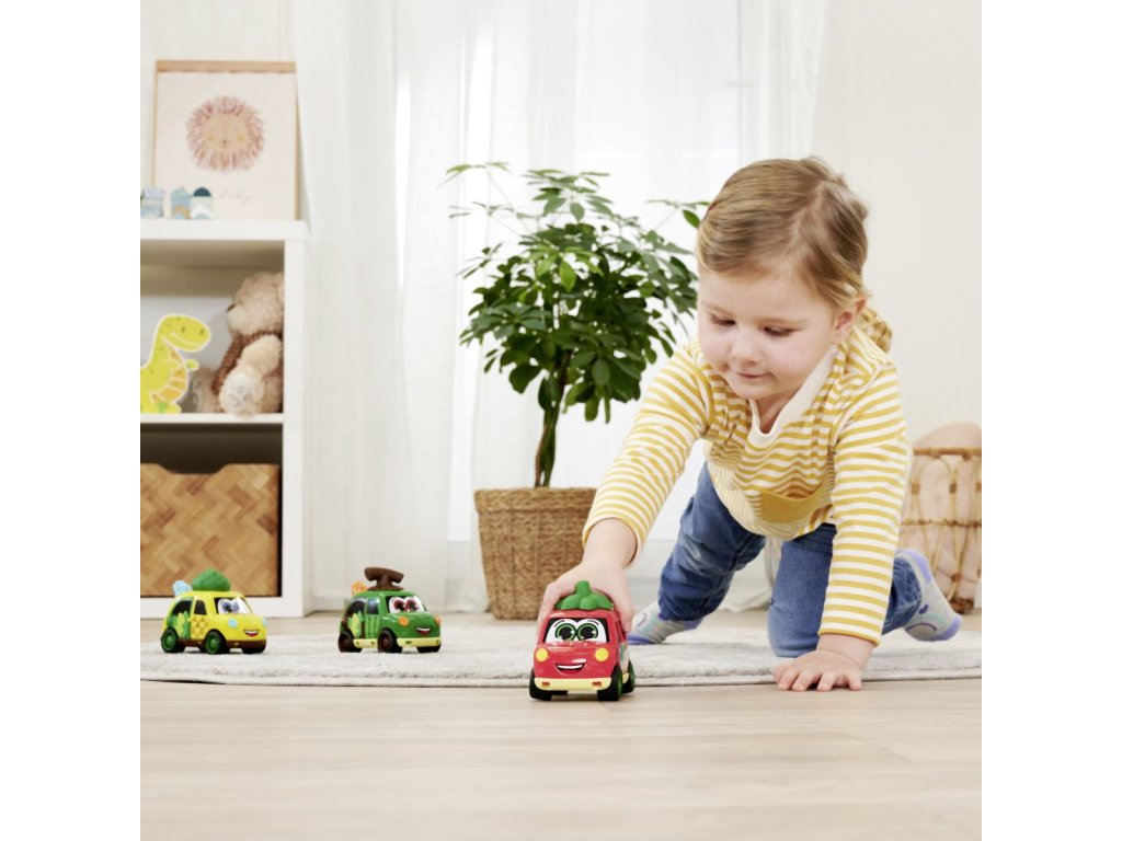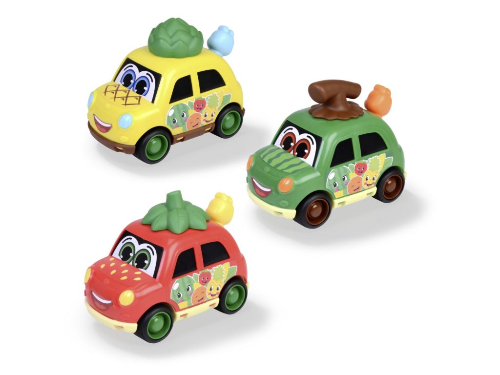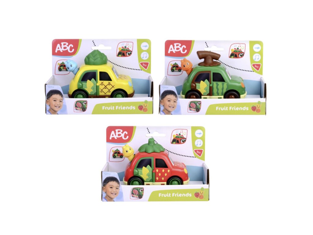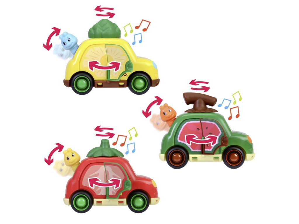 Autíčko s motivem ovoce na volnoběh, natahovací hrací strojek na střeše autíčka, pohyblivé dveře a pohyblivý červík. 3 druhy - ananas, meloun, jahoda. Velikost autíčka 12 cm.Doplňkové parametry