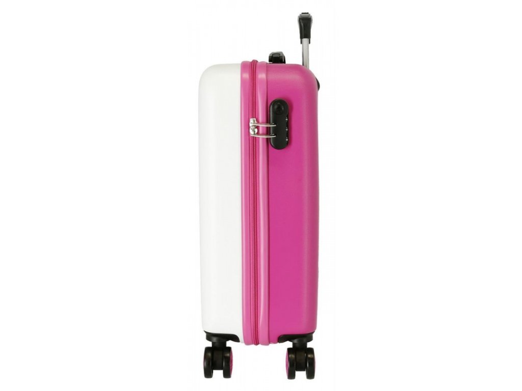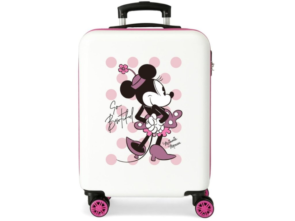 Stylový kabinový kufr Disney Minnie Mouse In Love v růžovo-bílém provedení je ideální společník na každou cestu. Vyroben z odolného ABS plastu, nabízí 4 otočná kolečka, kombinační zámek a propracovaný vnitřní prostor pro pohodlné balení. S objemem 35 la váhou pouhých 2,5 kg spojuje praktičnost, lehkost a nezaměnitelný Disney design.