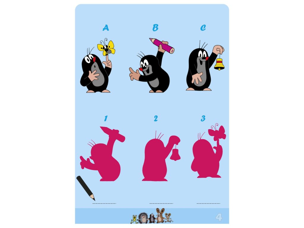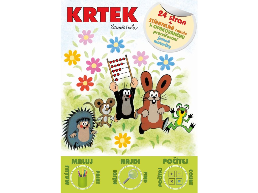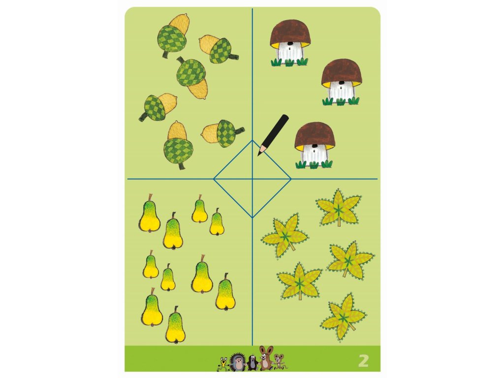 obálka s lesklou povrchovou úpravou + 24 vnitřních stran + stíratelná tabule, na každé stránce jsu aktivní prvky spojené s poznáváním barev, tvarůb včetně písmen a číslic, jednoduchého počítání, hlavolamy, bludiště, dětské sudoku atd., pro kontrolu správnosti je uvedeno správné řešeníDoplňkové parametry