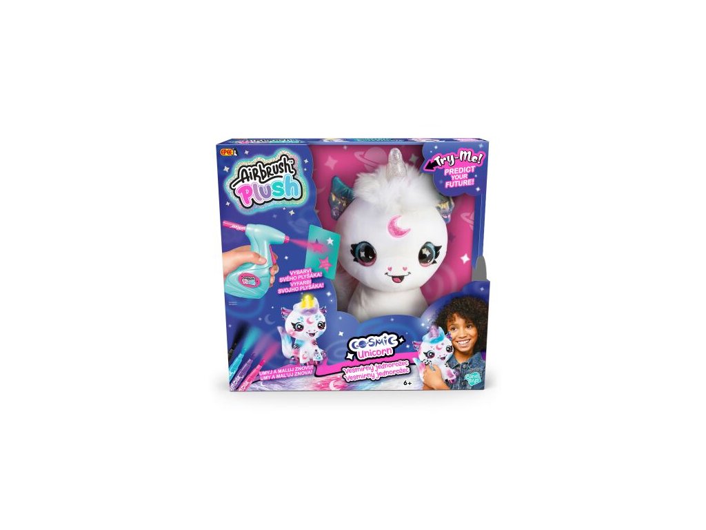 Navrhni a vybarvi si svého vesmírného jednorožce. Součástí tohoto balení je plyšové zvířátko, airbrush nástroj, 4 různé barevné náplně, 100 různých šablon a návod. Plyšové zvířátko si můžeš pomocí airbrushe libovolně posprejovat, můžeš využít různé barvy a šablony. Fantazii se meze nekladou. Pokud se ti vytvořený design přestane líbit, stačí plyšáka omýt vodou a můžeš začít znovu. Plyšákovi svítí kouzelný roh a může odpovědět na otázku ano-ne (jazyk hračky je angličtina).Doplňkové parametry