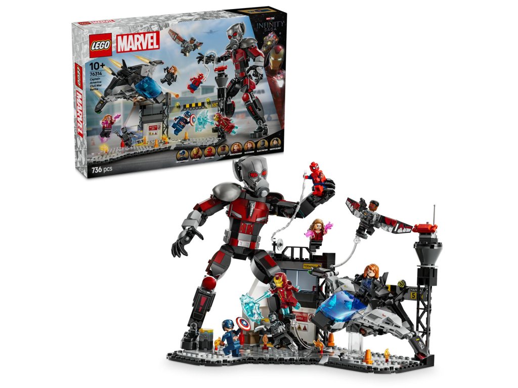 Akční bitva – Captain America: Občanská válka (76314) je propracovaná stavebnice z řady LEGO® Marvel, která představuje epický superhrdinský dárek pro děti od 10 let. Tato stavebnice LEGO obsahuje 9 figurek LEGO Marvel, letadlo Quinjet a spoustu doplňků, se kterým si děti připomenou své oblíbené momenty z filmu, prozkoumají nekonečná nápaditá dobrodružství a vymyslí si vlastní způsoby vystavení. Tato sestavitelná stavebnice je inspirovaná scénou bitvy na letišti z filmu Captain America: Občanská válka od studia od Marvel. Obsahuje 8 minifigurek – Kapitána Ameriku, Winter Soldiera, Wandu, Falcona, Iron Mana, Spider-Mana, Black Widow a Black Panthera – se zbraněmi a doplňky a plně pohyblivého Ant-Mana, který měří přes 24 cm na výšku. Letadlo Quinjet má sklopná křídla a otevírací kokpit, do kterého lze usadit minifigurku pilota. Prvek vybuchujícího sudu zakomponovaný do scenérie letiště modelu dodává nádech bitvy. Děti si mohou model během stavění přibližovat a otáčet pomocí digitální aplikace LEGO Builder.Doplňkové parametry