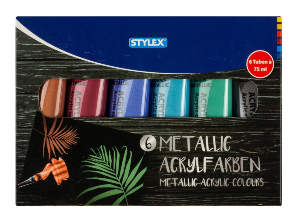 Popis produktuAkrylové barvy, metalické barvy, 6 tub a 75 ml, matné, 6 různých barev, matné vodou ředitelné barvy pro malování a ruční práci, vhodné pro mnoho povrchůvysoce pigmentované a vodotěsné,balené v dárkové krabičce Univerzální malířské a řemeslné barvy v sadě s metalickými odstíny zlatá, měď, modrá, tyrkysová, zelená a stříbrná, 6 tub a 75 ml.Vysoce pigmentované akrylové barvy, na vodní bázi, pro malování papíru, lepenky, plátna, kamene, kovu, kůže, mnoha plastů a jiných povrchů.Akrylová barva je vodou ředitelná a může být vzájemně smíchána a nanášena štětcem nebo špachtlí.Nátěr není nutný, protože barva je velmi neprůhledná.Doplňkové parametry
