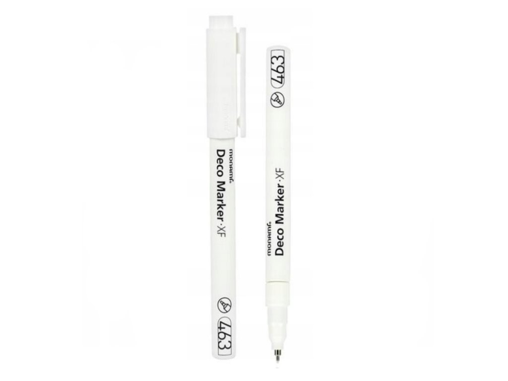 Akrylový popisovač Monami Deco 463 XF - bílý, 0,7 mm. Vodní báze, netoxický, bez zápachu. Tenký hrot pro detailní zdobení. Krycí i na tmavých površích. Píše na dřevo, kov, plast, sklo, textil a další materiály.