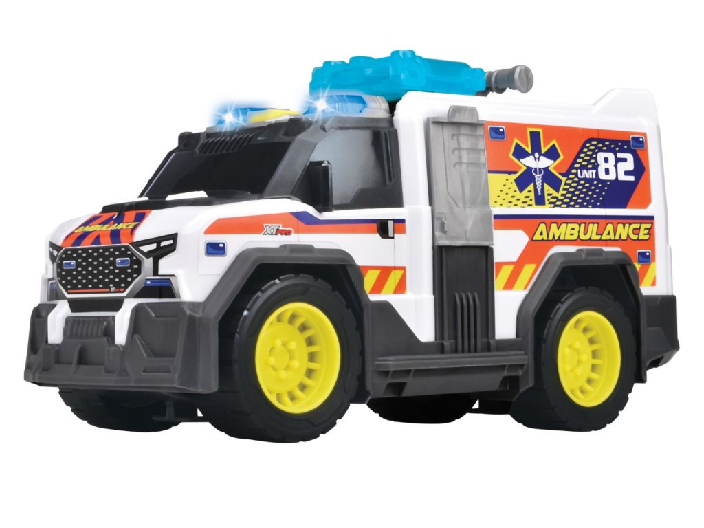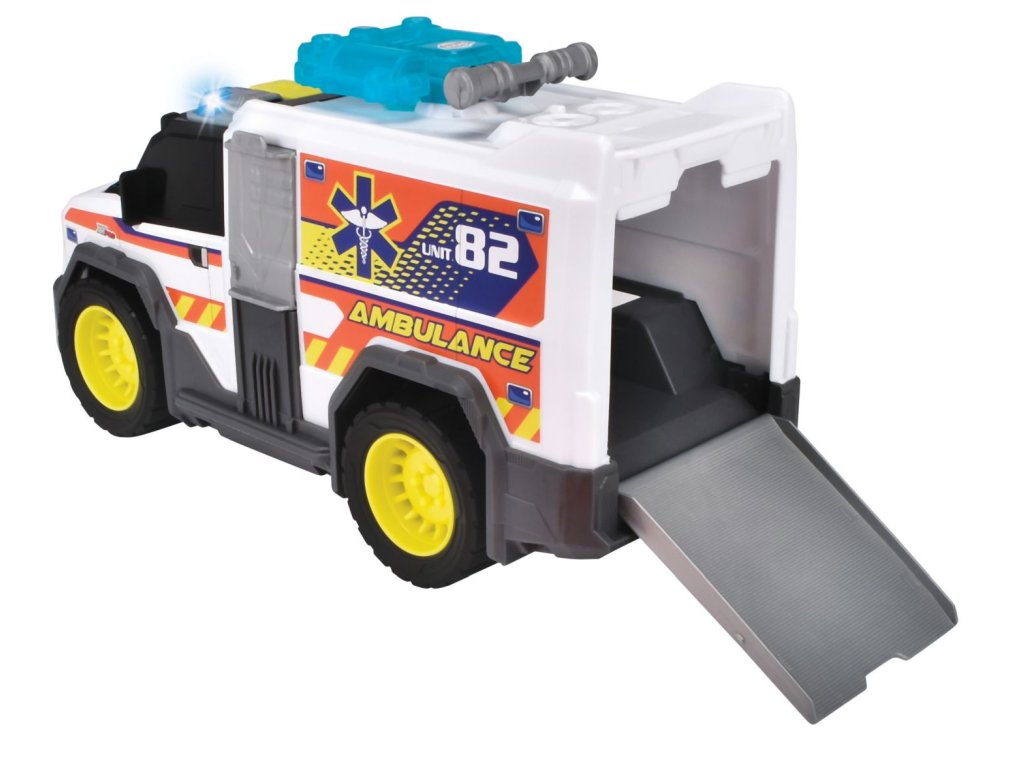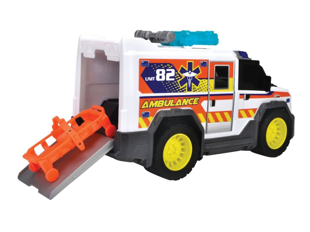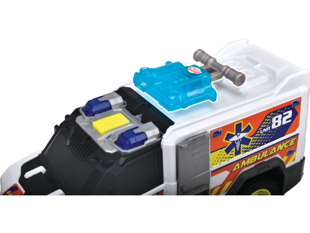 Auto ambulance na volnoběh s nosítky. Světelné a zvukové efekty, manuální vystřelovací funkce, otevírací zadní dveře a boční zásuvné úložiště. Tajná skrýš v podvozku, kde je možné ukrýt vystřelovací disky a nosítka, Délka 30 cm.Doplňkové parametry