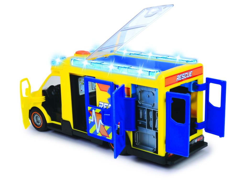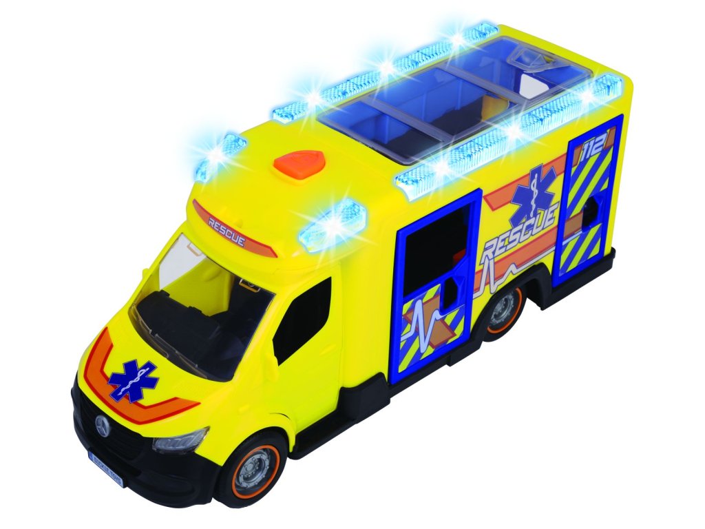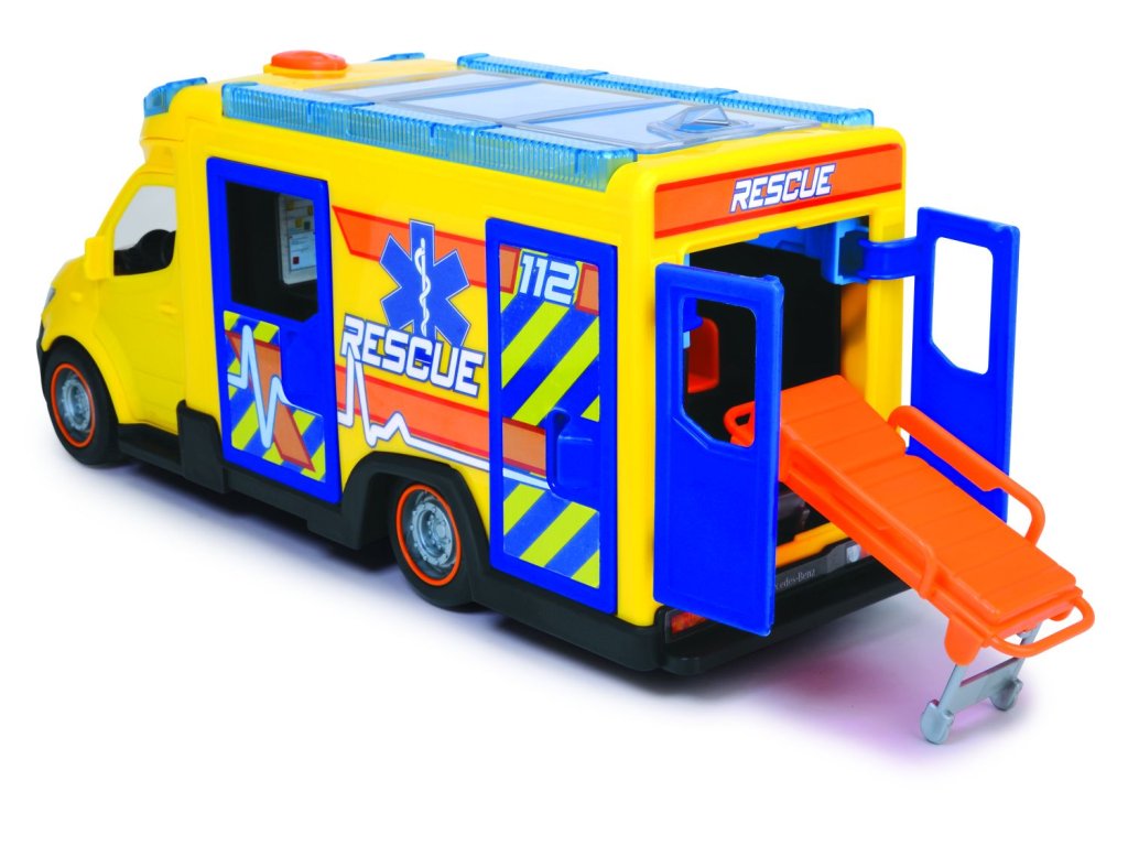 Ambulance na volnoběh, světelný a zvukový efekt, otevírací dveře a střecha, interiér, lehátko a další příslušenství. Délka 34,5 cm.Doplňkové parametry