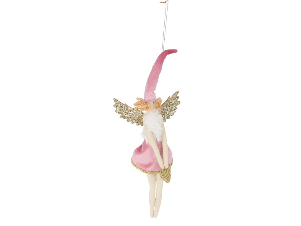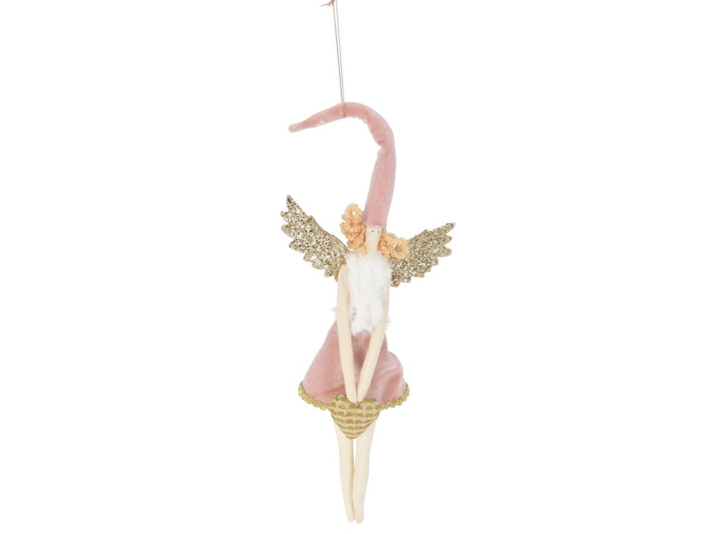 Děvčátko s kudrnatými vlásky, dlouhou čepicí a třpytivými, zlatými křídly jako závěsná vánoční dekorace.
