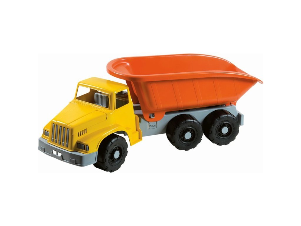 Obří plastové auto sklápěč v hnědé ekologické krabici. Vyrobené z kvalitních plastů v Itálii. Nosnost vozidla max 100 kg. Rozměry balení: 77 x 27,5 x 25 cm (d x š x v). Váha: 3,15 kg. Doporučený věk od 36 měsíců. Výrobce, italská firma Androni Giocattoli sídlící nedaleko Milána, se specializuje na výrobu plastových hraček na písek a zahradu a také stavebnic UNICO Plus již od roku 1974. Jejím mottem je heslo: Androni Toys: Kvalita vyrobená v Itálii. Používané plasty jsou pevné, ale zároveň pružné a při běžném hraní nedochází k jejich praskání. Vydrží i větší zátěž a proto jsou výrobky vhodné i do školek, kde téměř denně procházejí zatěžkávací zkouškou.Doplňkové parametry