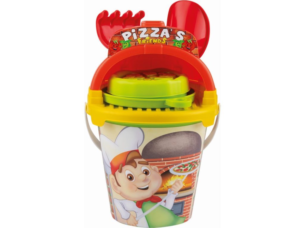 7dílná sada na písek, vyrobená z kvalitních plastů v Itálii. Obsahuje: Kyblík, síto ve tvaru pizza pece, lopatku a hrabičky, tvořítko ve tvaru formy na pečení a tvořítko na pizzu a pletenec. Kyblík: průměr 17 cm, výška 16 cm. Sada: výška 27 cm, váha 0,24 kg. Doporučený věk od 12 měsíců.Doplňkové parametry