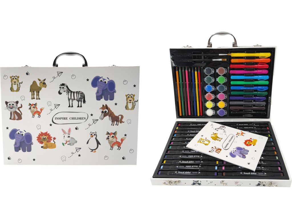 ARTO Výtvarný kufřík - Zvířátka je ideální dárek pro všechny malé umělce a milovníky zvířátek. V balení jsou i roztomilé omalovánky se zvířátky. Podněcuje kreativitu, fantazii a jemnou motoriku. Celý kufřík je navržen tak, aby byl praktický a snadno přenosný. Všechny pomůcky mají své přesně vymezené místo, takže se v kufříku udržuje pořádek a nic se neztratí. Díky pevnému uzávěru se nemusíš bát, že se kufřík samovolně otevře. A co se skrývá uvnitř tohoto zvířecího království? Otevřením kufříku objevíš bohatou výbavu pro malé i velké milovníky přírody a zvířat: Pastelky: Sada barevných pastelek v přírodních i pestrých odstínech, které hladce kloužou po papíře a umožní ti vykreslit i ty nejjemnější detaily srsti, peří nebo šupin. Oboustranné fixy: Jasné a syté fixy pro výrazné obrysy a vyplňování větších ploch. S nimi oživíš barevné peří papouška, pruhy zebry nebo skvrny dalmatina. Z jedné strany mají fixy tenký hrot a z druhé jako zvýrazňovač. Vysouvací voskovky: Hladké voskovky s bohatou pigmentací, ideální pro nanášení vrstev a vytváření různých textur – od hebké kočičí srsti po drsnou kůru stromu, na kterém sedí veverka. Tekuté vodové barvy: Paleta vodových barev v zemitých i jasných tónech. S trochou vody a štětce můžeš vytvářet jemné stínování a prolínající se barvy, které dodají tvým zvířecím portrétům živost.Doplňkové parametry