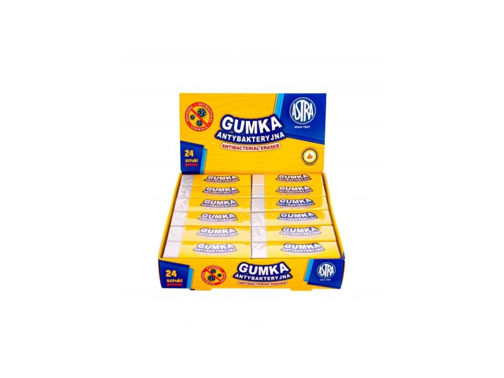 Guma nesmí chybět v žádném školním penálu či pouzdře, využijete ji v kanceláři iv domácnosti. Měkká univerzální guma ASTRA ANTIBAKTERIAL dokáže efektivně vygumovat nežádoucí tahy tužkami různé tvrdosti, a to téměř ze všech povrchů. Její struktura je hladká a neabrazivní, díky čemuž nedochází k poškození papíru. Navíc je vyrobena ze speciálního materiálu na kterém se nemnoží žádné bakterie.• 60 x 20 x 11mm