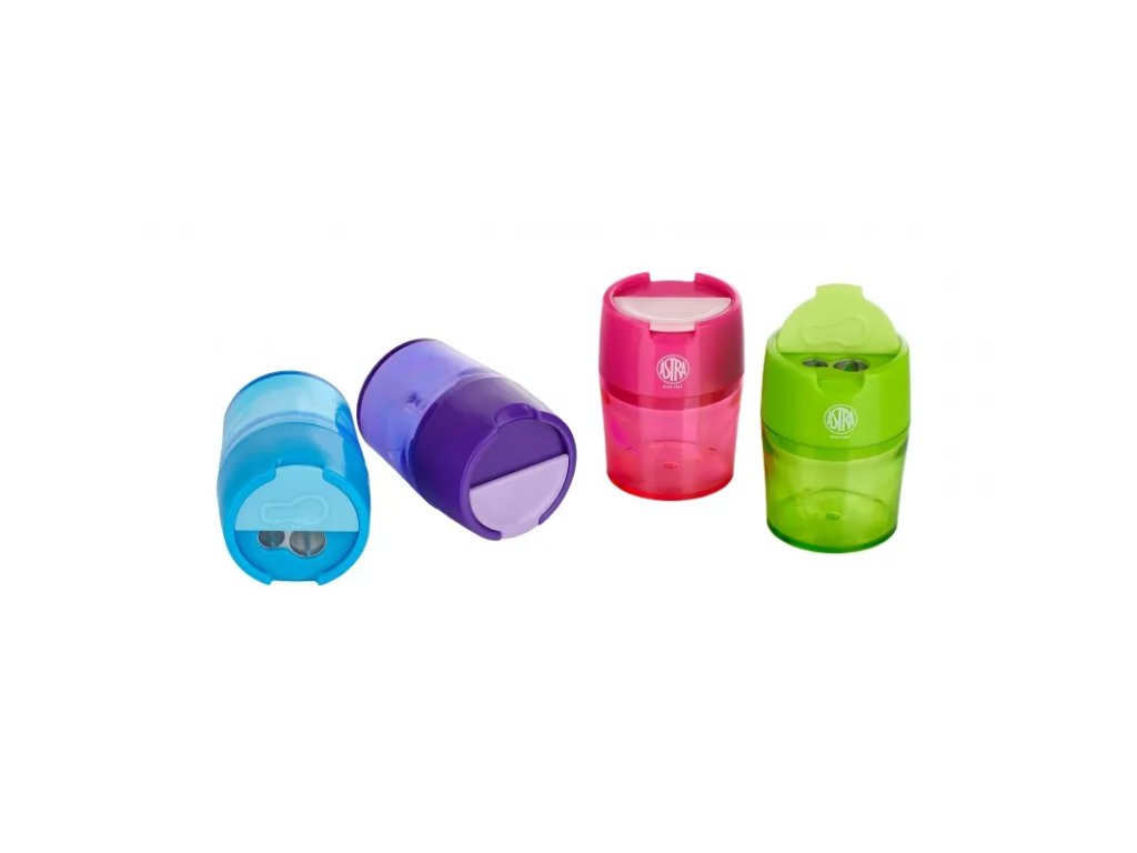 Dvojité plastové struhadlo na tužky o průměru 6 a 10 mm as praktickým zásobníkem. Zboží máme skladem, připraveno k odeslání.• mix čtyř barev ve stojanu (3x fialová, 3x modrá, 3x růžová, 3x zelená)