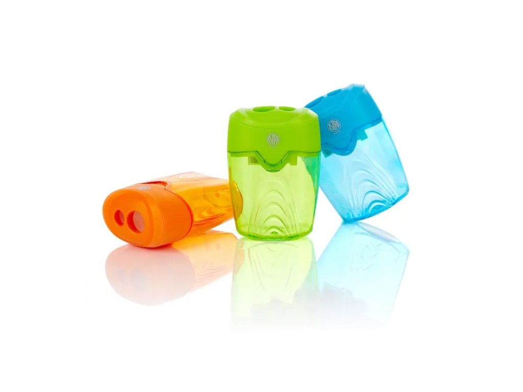 Dvojité plastové struhadlo na tužky o průměru 8 a 11 mm as praktickým zásobníkem. Zboží máme skladem, připraveno k odeslání,• mix tří barev ve stojanu (6x oranžová, 6x zelená, 6x modrá)