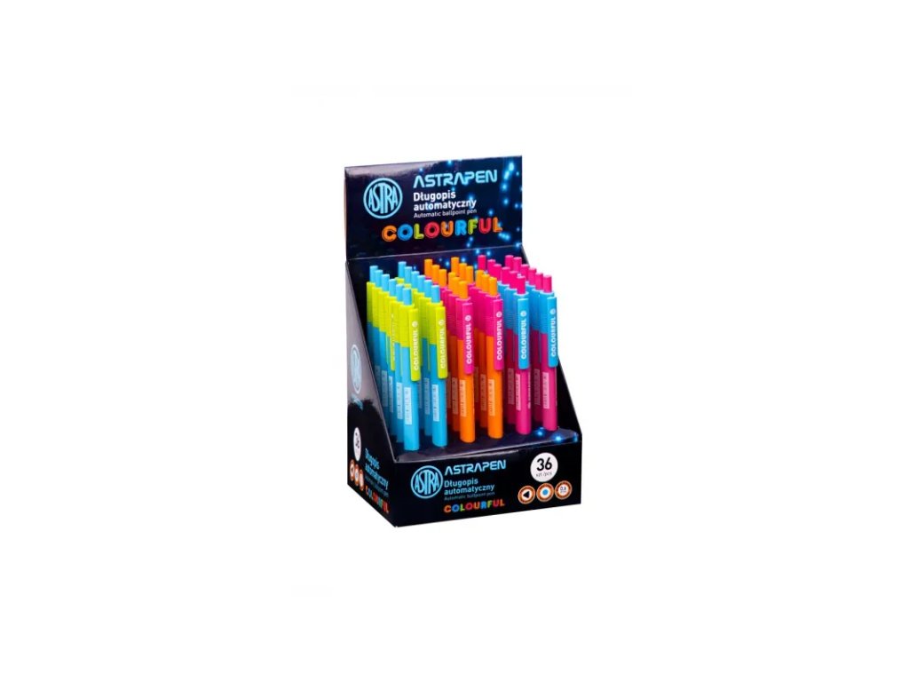 Plastové kuličkové pero ASTRAPEN Colorful o tloušťce stopy 0,6mm. Máte-li zájem o konkrétní model (barvu), uveďte to do poznámky při dokončení objednávky. Celý stojan obsahuje 36ks.