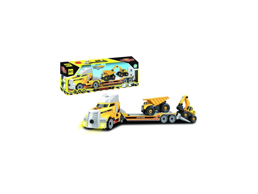 Rozměry tahače 62x10x15 cm. Volná kola. Balení obsahuje tahač a 2 stavební stroje 16 cm (sklápěč, bagr), křížový šroubovák (v rukojeti je klíč na matice). Vydává světelné a zvukové efekty. Aktivace efektů se provádí ON/OFF přepínačem na spodní straně tahače. Typ a počet baterií: 3xAG13 baterie součástí - tahač.Doplňkové parametry