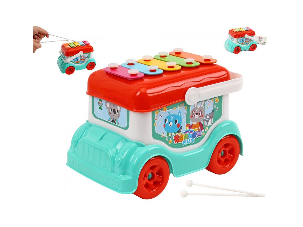 Autobus na volný chod s xylofonem. Baleno v síťce. Rozměr: 19 x 13,8 x 12,5 cm. Materiál: plast.Doplňkové parametry