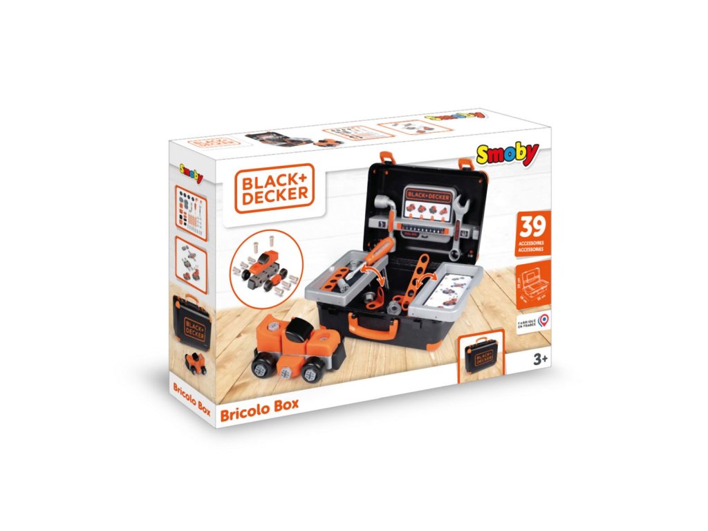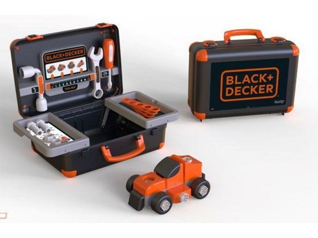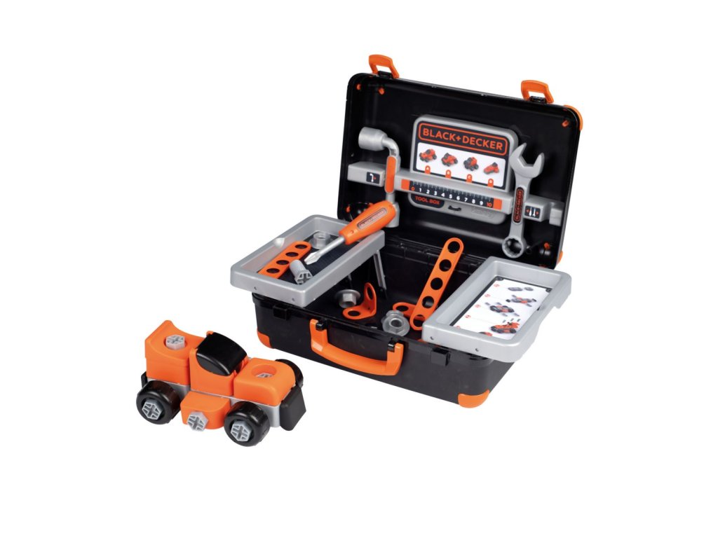 Kufr na nářadí v licenci Black&Decker s výklopnými úložnými přihrádkami, autíčkem pro montáž /demontáž. Nechybí nářadí, šroubky, matičky a další příslušenství. Rozměry kufříku: 35,50 x 28,50 x 28,60 cm.Doplňkové parametry