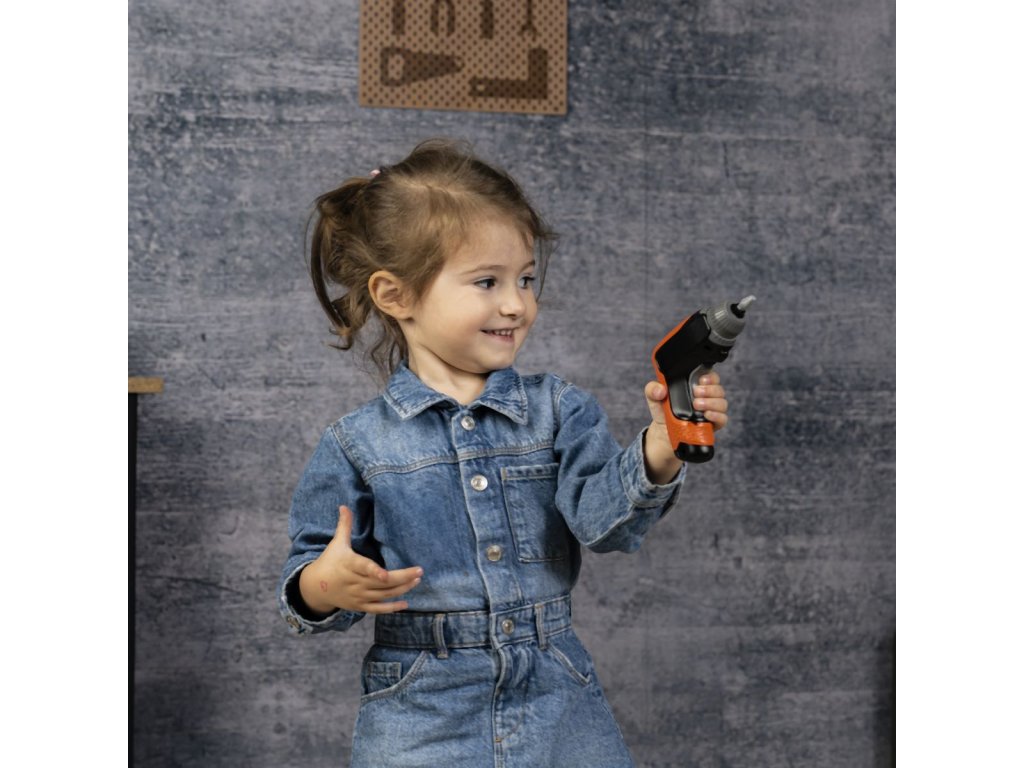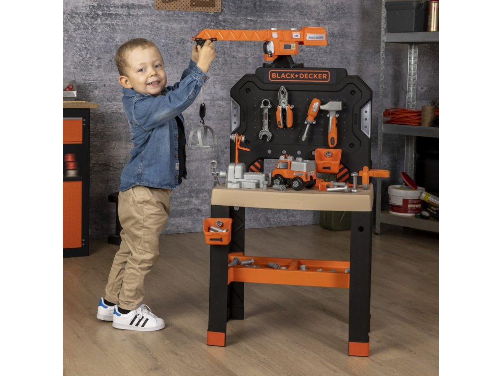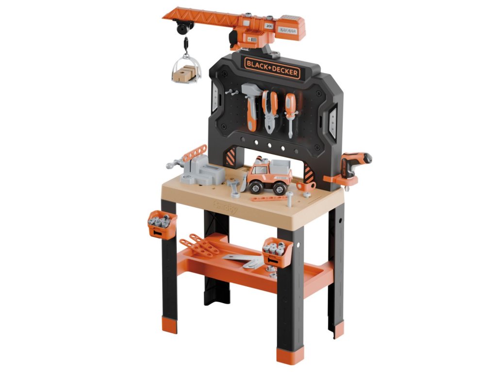 Velký, stabilní dětský pracovní stůl v originálním designu Black+Decker s velkým otočným jeřábem, mechanickým aku šroubovákem, spoustou nářadí a příslušenství a stavebnicí auta. Celkem 80 ks příslušenství a 7 nástrojů. Velká pracovní plocha v designu dřeva a četné odkládací přihrádky nabízejí dostatek místa pro širokou škálu příslušenství. Kromě mechanického akumulátorového šroubováku je na přední straně kladívko, klíč na kola, šroubovák, klíč, kleště a pila a také velká svorka a posuvné pravítko. Zábavná funkce zatlokání hřebíků zajistí spousty zábavy. Se stavebnicí mohou malí mechanici sestavit skutečné auto v několika jednoduchých krocích. Vybavení doplňují šrouby, matice, hřebíky a různé upevňovací materiály. Rozšiřitelné a kompatibilní se všemi nástroji Black+Decker od Smoby. Tento výrobek obsahuje minimálně 59 % recyklovaného materiálu. Rozměry produktu (DxŠxV): 36 x 57,5 x 102 cm.Doplňkové parametry