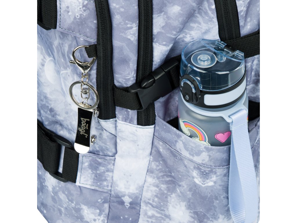 • Boční kapsy z pevné materiálu, které jsou vhodné pro jednu z našich lahví na pití.