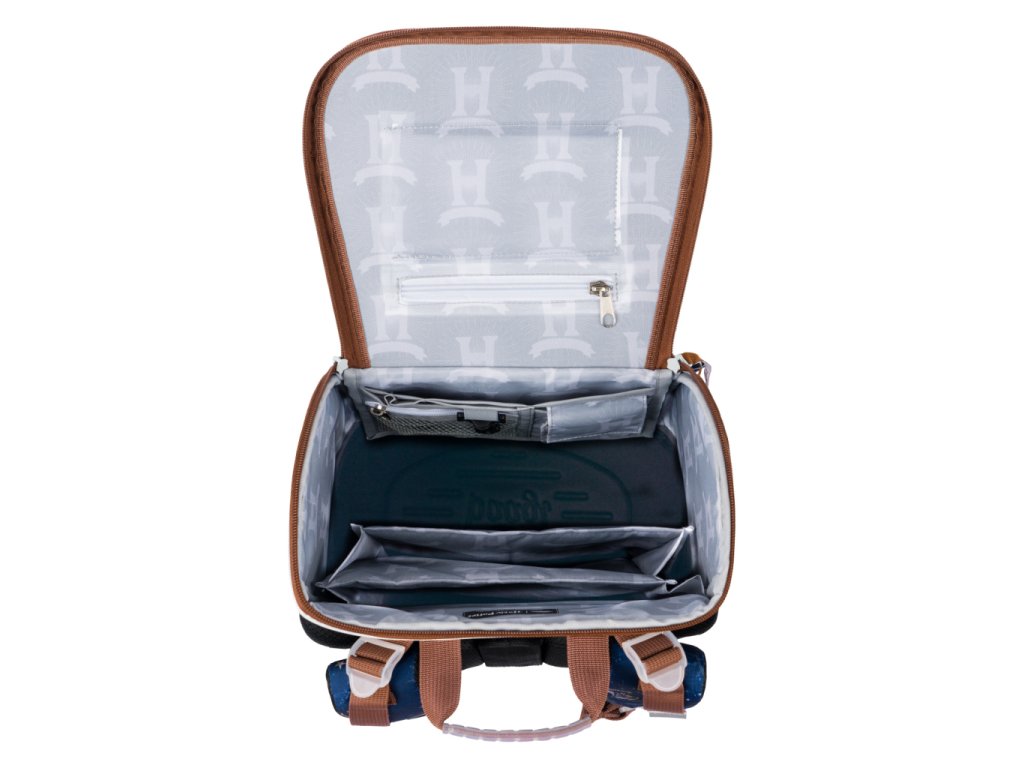 • Uvnitř aktovky je průhledná kapsa s rozvrhem a vnitřní organizér umožňující rovnoměrné rozložení hmotnosti, doplněný gumičkou pro fixaci.