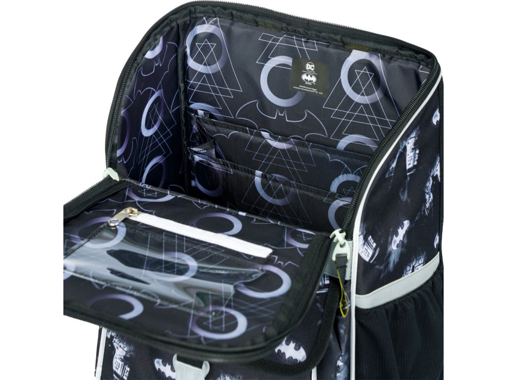 • Uvnitř aktovky je průhledná kapsa na rozvrh a vnitřní organizér umožňující rovnoměrné rozložení hmotnosti, doplněný gumičkou pro fixaci.
