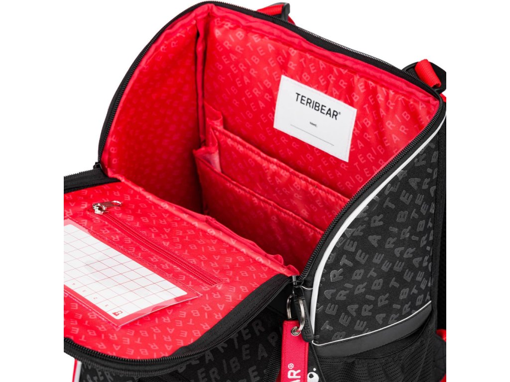• Uvnitř aktovky je průhledná kapsa s rozvrhem a vnitřní organizér umožňující rovnoměrné rozložení hmotnosti, doplněný gumičkou pro fixaci.