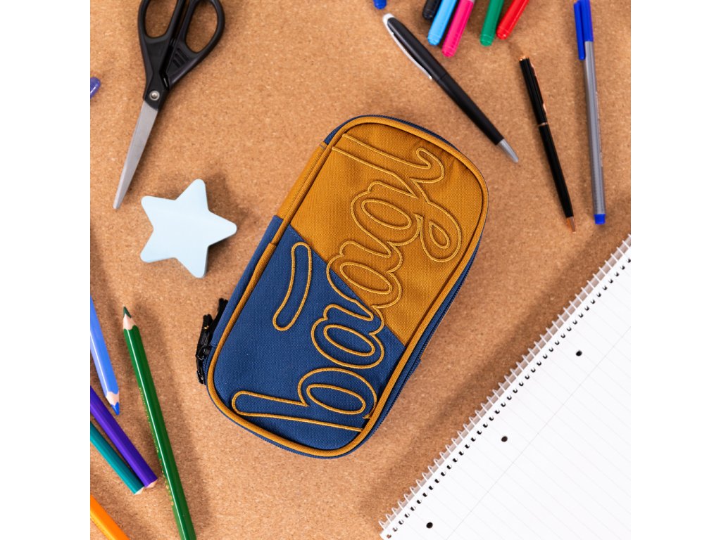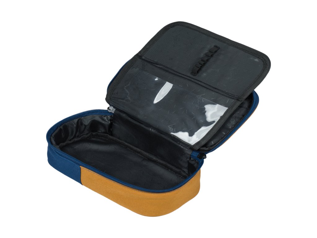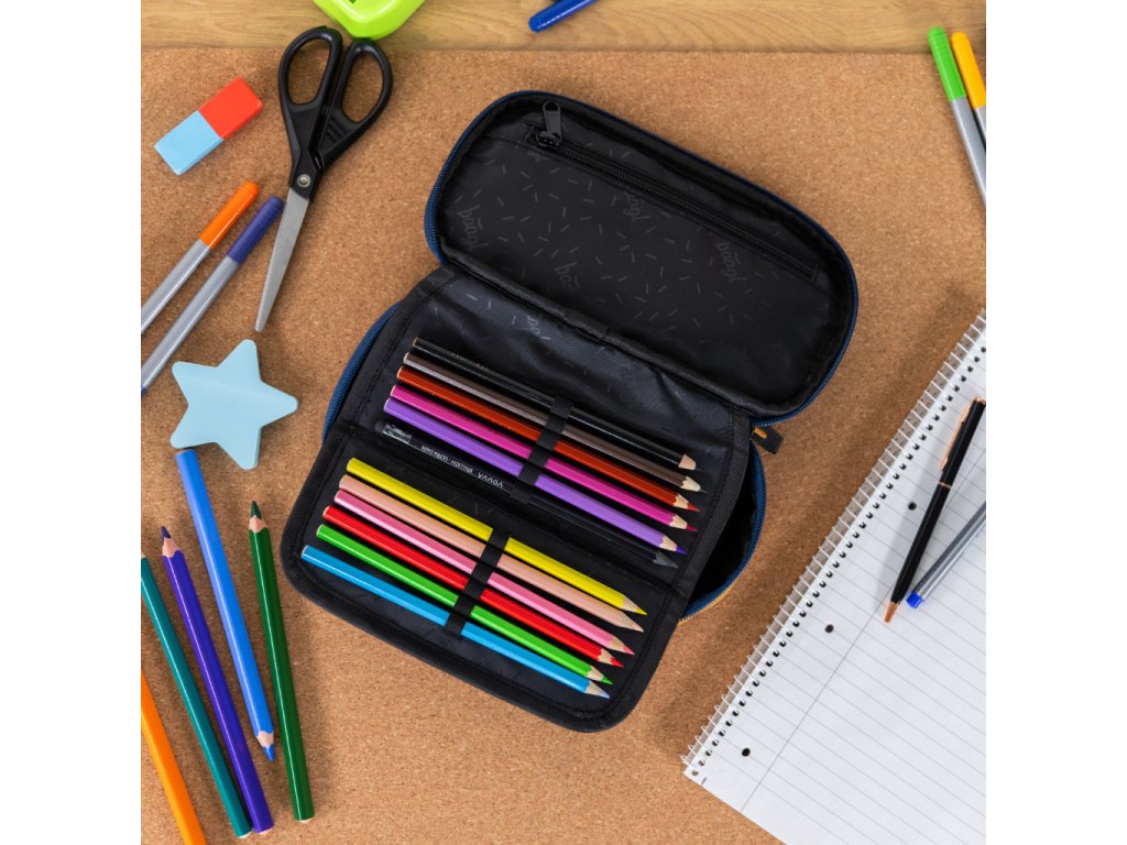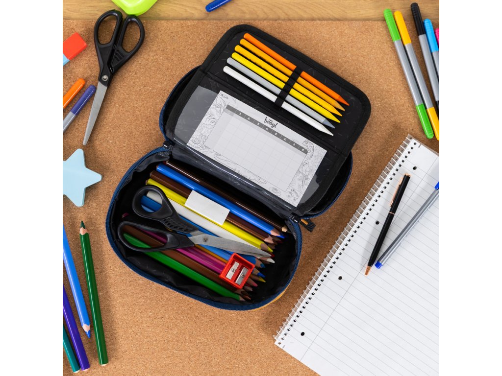 • Kompaktní penál na zip s prostornou hlavní komorou a dvojitou výklopnou chlopní nabízí dostatek prostoru pro psací potřeby i drobnosti.• Součástí penálu je také vnitřní kapsa a okénko na rozvrh hodin.