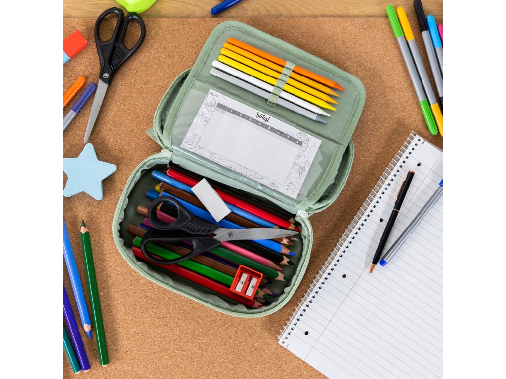 • Kompaktní penál na zip s prostornou hlavní komorou a dvojitou výklopnou chlopní nabízí dostatek prostoru pro psací potřeby i drobnosti.• Součástí penálu je také vnitřní kapsa a okénko na rozvrh hodin.