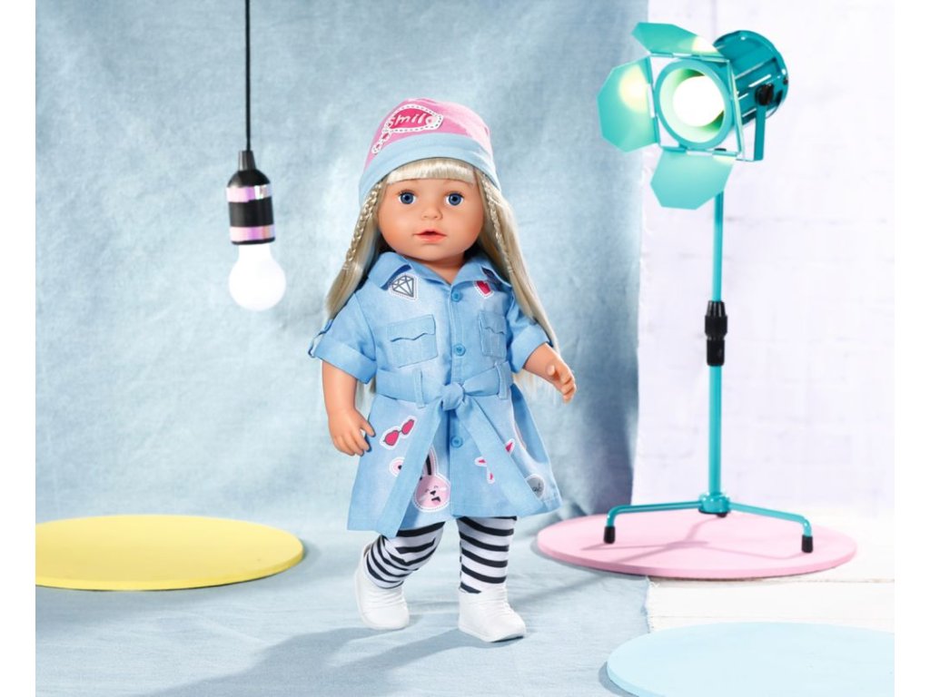 Tento kousek oblečení vypadá jako ležérní košile, ale přitom je elegantní jako halenka a dlouhý jako šaty. Co to může být? Jasně – košilové šaty! Model BABY born v džínovém vzhledu má hravé ohrnutí rukávů, symetrický límec, našité kapsy a pásek na zavazování. Šaty zdobí roztomilé potisky, které připomínají nášivky. Pod nimi malá parádnice nosí černobílé pruhované legíny a bílé tenisky. A na hlavu přijde růžová čepička. • Kvalitní oblečení pro originální panenku BABY born. • Pro radost z nápadité, rozmanité a dlouhotrvající hry. BABY born Džínové šaty Deluxe pro panenky velikosti 43 cm. Součástí jsou šaty, legíny, čepice a boty.Doplňkové parametry