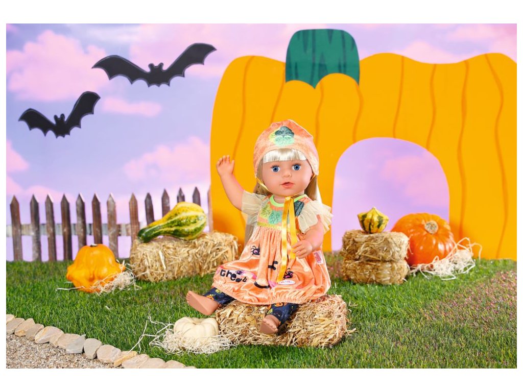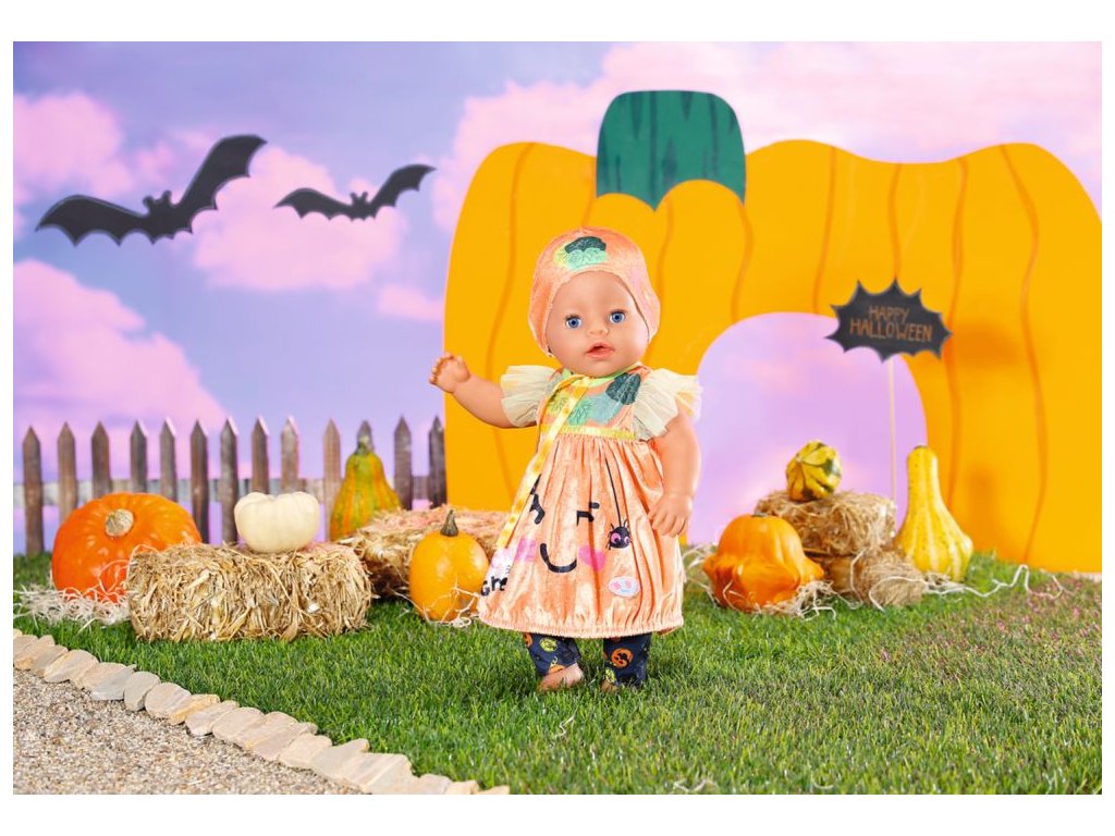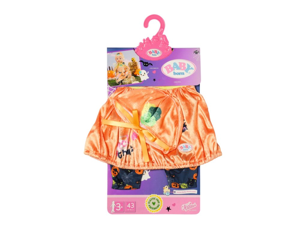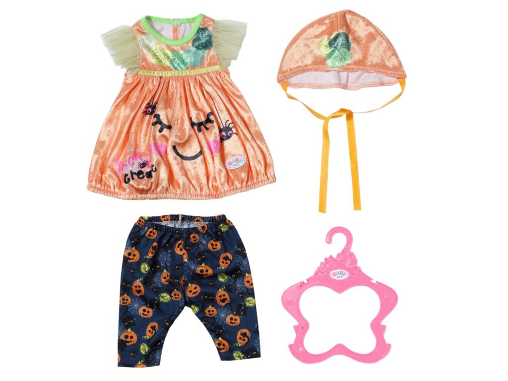 „Koledu, nebo něco provedu!“ Dobře, dobře, BABY born koleduje tak roztomile, že se jí prostě nedá odolat. BABY born si oblékla svůj krásný halloweenský kostým, aby mohla jít spolu se svými rodiči koledovat a přinést si domů spoustu sladkostí. V balónových šatičkách a oranžové čepičce vypadá jako dýně. Ozdobné lístečky na čepičce a na šatičkách jsou moc roztomilé. Na tmavě šedé legíny se vplížilo několik pavoučků a černých koček. Samozřejmě jsou na nich také obrázky dýní. Protože co by to bylo za Halloween bez dýní? • Kvalitní oblečení pro značkovou panenku BABY born. • Pro radost z nápadité, rozmanité a dlouhotrvající hry. BABY born Kostým na Halloween pro panenky BABY born velikosti 43 cm. Součástí jsou šatičky, legíny a čepička. Včetně ramínka.Doplňkové parametry