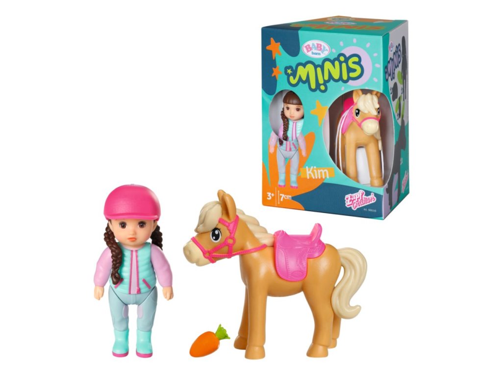 Roztomilá mini panenka Kim je připravena na vyjížďku ve svém elegantním jezdeckém oblečku se slušivou růžovou helmou. Jejímu koníkovi se ale dnes ven moc nechce. Nevadí! Kim totiž ví jak na něj a má připravený trik. Pomocí lahodné mrkvičky koníka chytře vyláká ze stáje a za chvíli už jsou oba připraveni odcválat za novým dobrodružstvím. • Panenka BABY born Minis Kim velikosti 7 cm. • Součástí je koník a mrkvička.Doplňkové parametry