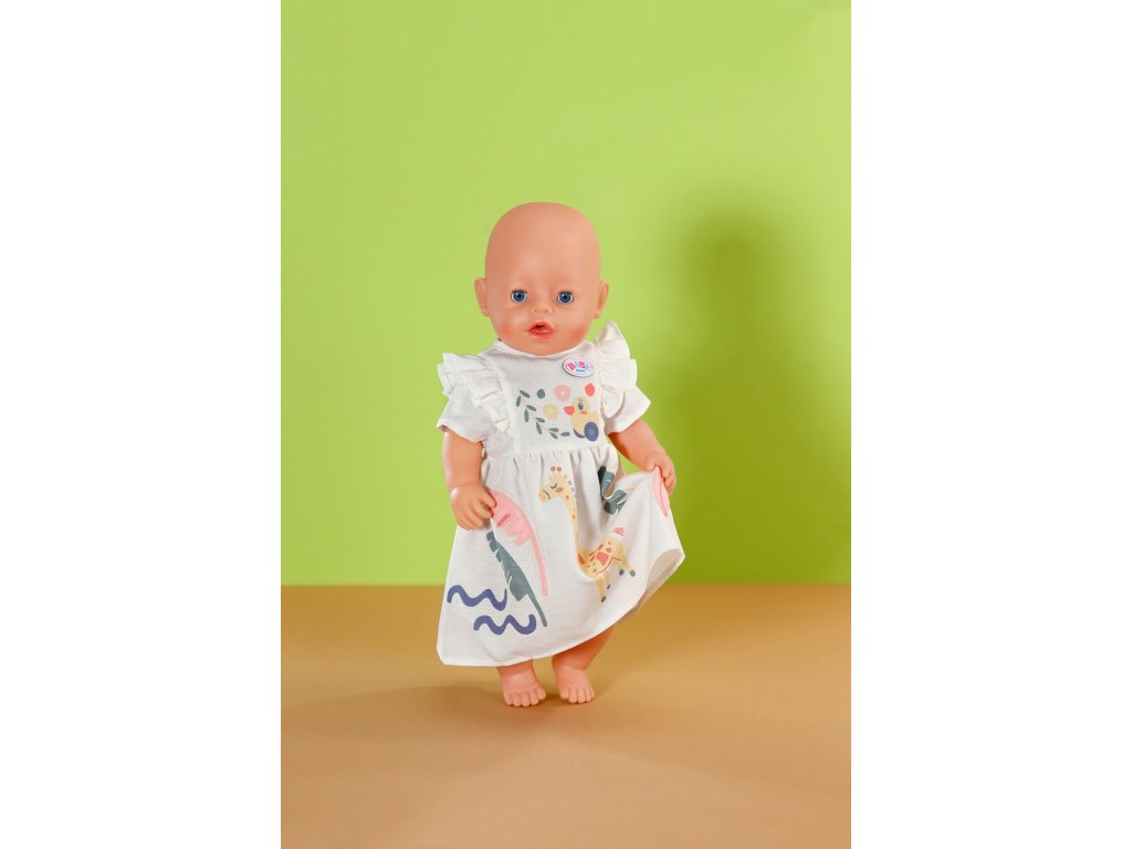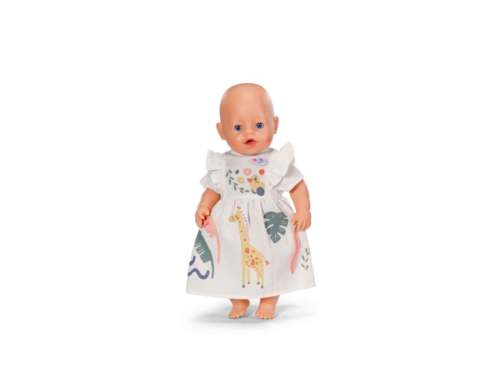 Světlé šaty s volánkovými rukávy, obrázkem žirafy a motivy džungle pro panenky velikosti 43 cm. • Letní nálada: Šaty s motivem žirafy a džungle. • Udržitelnost: Součástí je ramínko z recyklovaného materiálu. • Vhodné pro panenky velikosti 43 cm a pro medvídky BABY born Teddy. • Kvalitní doplněk pro radost z nápadité, rozmanité a dlouhotrvající hry.Doplňkové parametry