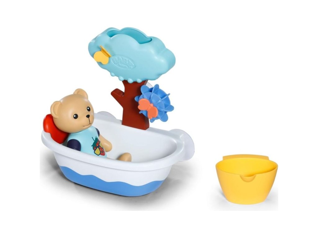 BABY born Splish Splash Teddy v koupacím oblečku s funkcí plavání a s hračkou do vany. • BABY born medvídek Teddy má praktickou velikost 15 cm, natištěný koupací obleček a mechanickou funkci plavání • Vanička se stromovou sprchou, otočným vodním kolem a nádobkou na vodu a s motýlky • S přísavkami pro upevnění na vanu nebo na sprchovou stěnu • Vhodné pro děti od 1 rokuDoplňkové parametry