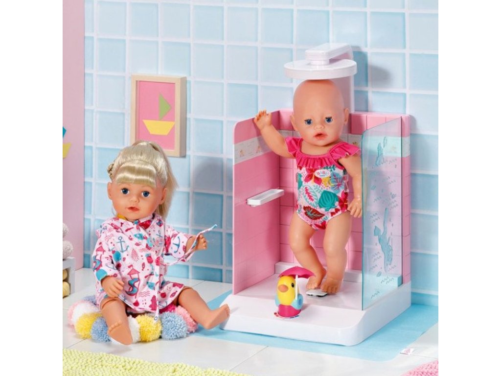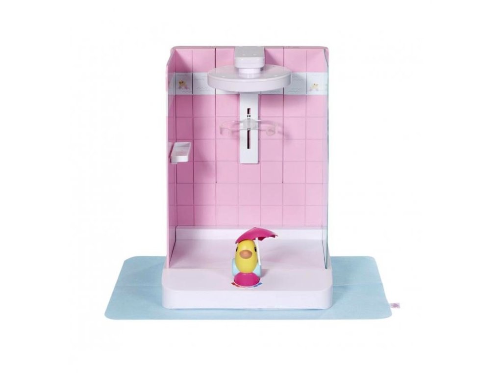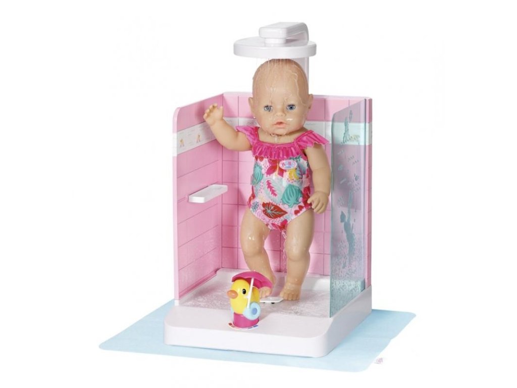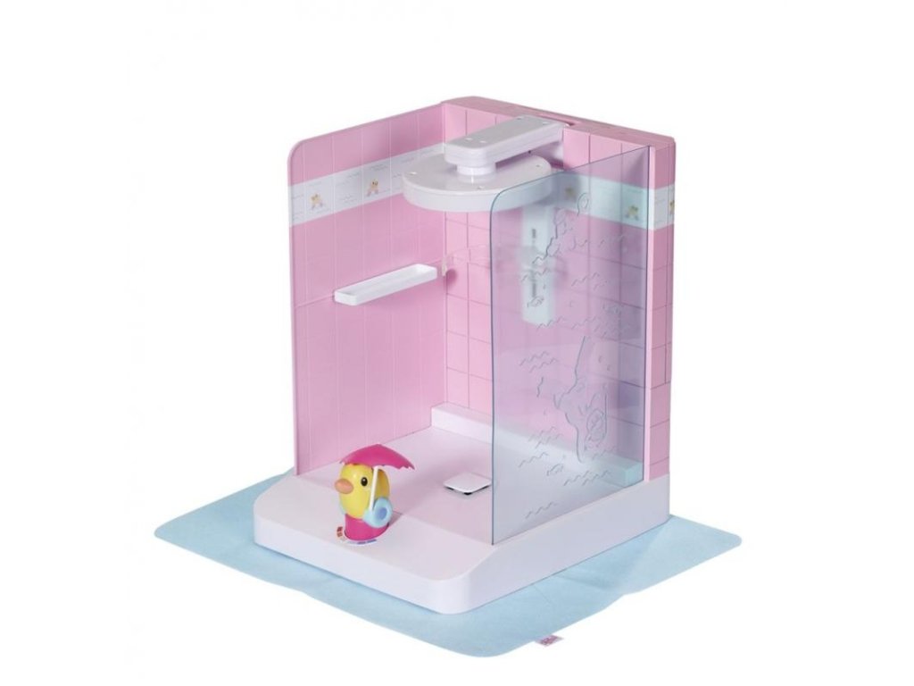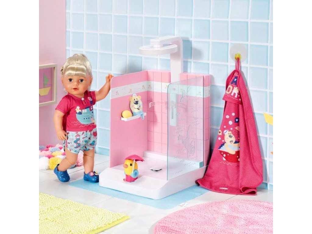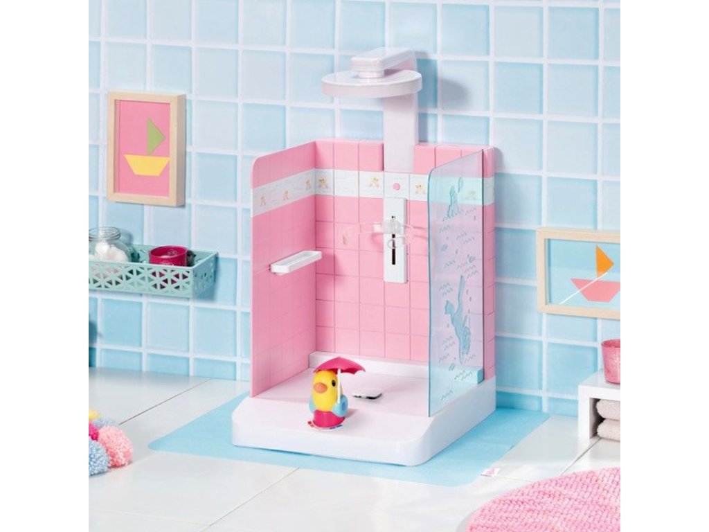 Koupání ve vaně se spoustou pěny je úžasná relaxace. Ale někdy na to prostě není čas. Tak hurá do sprchy! Panenka BABY born se připevní do stojánku a zábava s vodou může začít. Pootočením kačenky Berty se spustí elektronické čerpadlo a ze sprchové hlavice začne téct skutečná voda. Je libo horkou sprchu nebo ledový adrenalin? Směšovací baterie ve tvaru kačenky ukazuje imaginární teplotu vody. Mimochodem, kačenku Bertu najdete také na dlaždicích a na skleněné stěně. Díky výškově nastavitelné sprchové hlavici je sprcha vhodná i pro Starší sestřičky a Starší bratříčky BABY born. Všichni členové rodiny BABY born si pod proudem vody užívají skvělou zábavu. Díky modré podložce proti stříkající vodě pod sprchou naštěstí nehrozí žádná potopa. • Kvalitní příslušenství pro originální panenku BABY born. • Pro radost z nápadité, rozmanité a dlouhotrvající hry. • Funguje na baterie (nejsou součástí). • Vhodný i pro menší panenky. BABY born Sprchový kout včetně podložky proti stříkající vodě.Doplňkové parametry