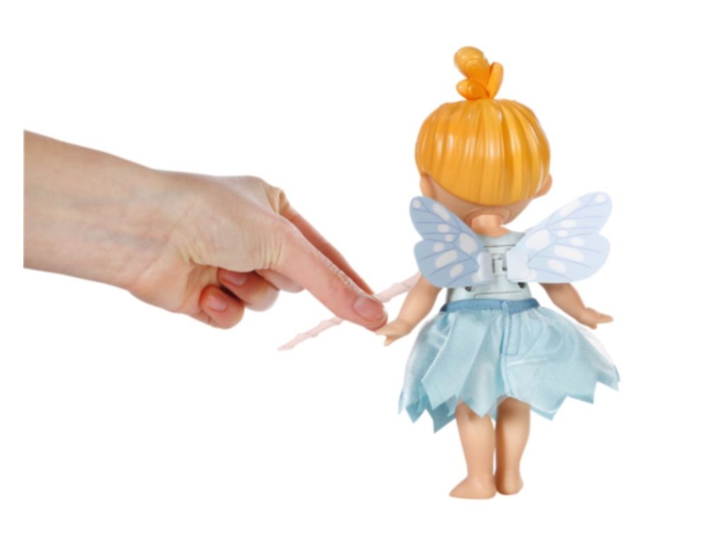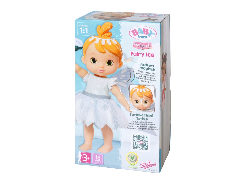 Ledová víla má na sobě jemně modré šaty připomínající ledové květiny. Když se jí dotkneš kouzelnou hůlkou na bříšku, začne mávat nádhernými křidélky. Na roztomilé tvářičce se ukrývají namalované ledové krystalky, které spatříš, jen když svítí slunce. Balení obsahuje i malou obrázkovou knížku a vlastní pódium, které můžeš použít ke hraní nádherných příběhů. Když se kouzelná hůlka zasune do pódia, osvětlí jeviště dvě kouzelná světýlka střídajícími se barvami. Kulisy scény jsou potištěny z obou stran a ukazují úžasný svět, ve kterém Ledová víla žije. Rozvážná a vždy všem nápomocná malá víla žije ve věži v nejchladnější části světa pohádek. Se svým nejlepším kamarádem ledňáčkem je vždy připravena každého vyslechnout a v případě potřeby se rázně ujímá vedení, protože za každé situace přesně ví, co je třeba udělat. • Originální panenka BABY born. • Velikost 18 cm. • S funkcí třepotajících křídel a malbou na obličeji, která mění barvu. • Podstavec s LED osvětlením. • Přináší svůj vlastní pohádkový svět. • Funguje na baterie (nejsou součástí). BABY born Storybook Ledová víla je panenka velikosti 18 cm. Součástí je kouzelná hůlka, pódium, kulisy a obrázková knížka.Doplňkové parametry
