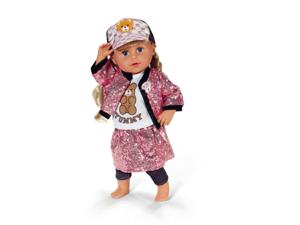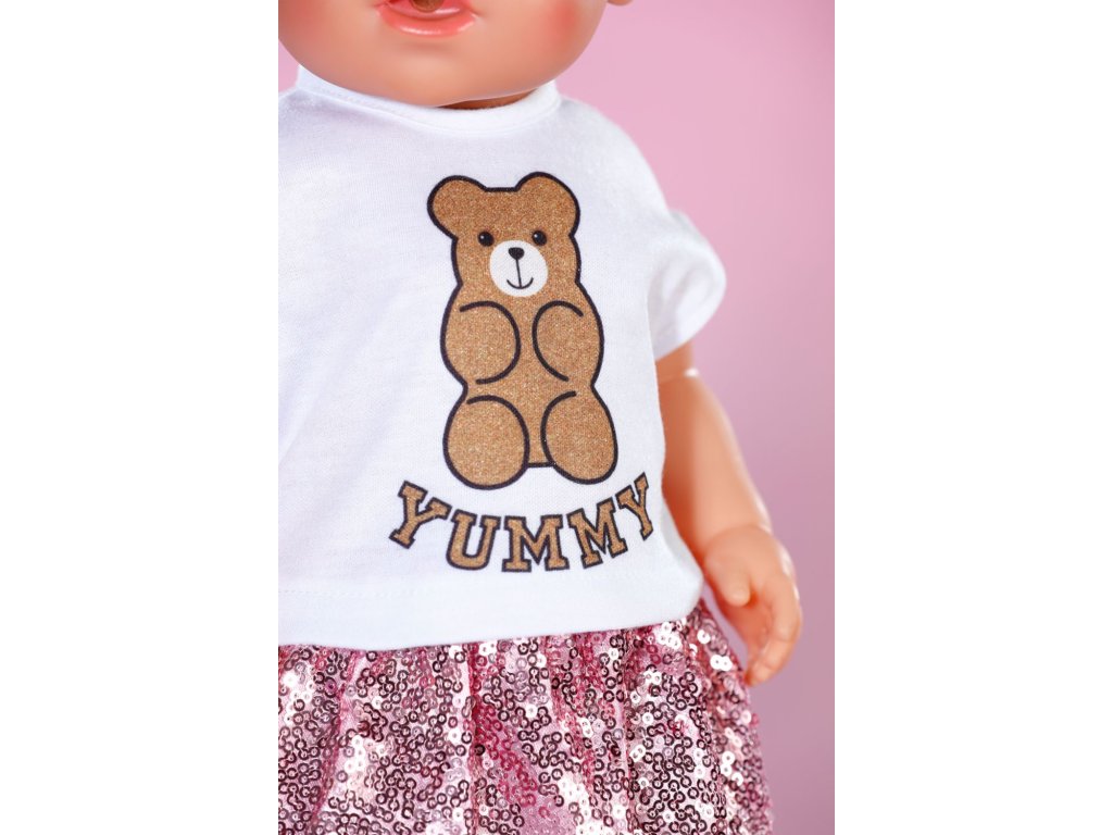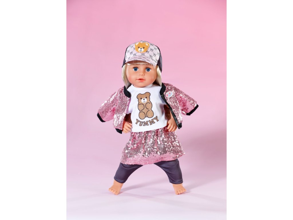 BABY born třpytivé oblečení s růžovou sukní a bundou z flitrů, tričkem s potiskem medvídka, čepicí a legínami pro panenky velikosti 43 cm. • Glamour na maximum: Outfit tvořený růžovou flitrovou bundou, sukní, tričkem, čepicí a legínami. • Udržitelnost: Součástí je ramínko z recyklovaného materiálu. • Vhodné pro panenky velikosti 43 cm a pro medvídky BABY born Teddy. • Kvalitní oblečení a doplňky pro radost z nápadité, rozmanité a dlouhotrvající hry.Doplňkové parametry
