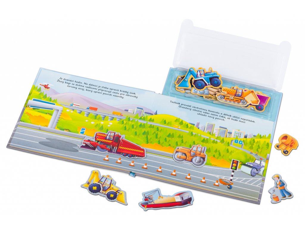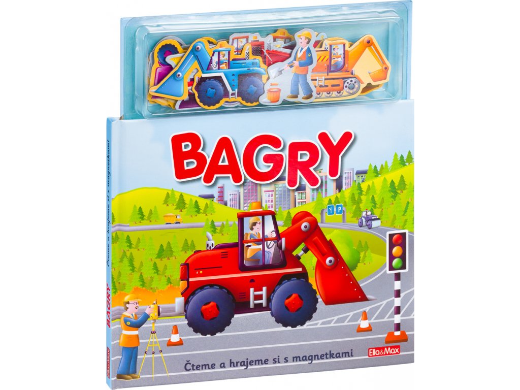Bagry jsou vždy připraveny pomáhat – stavět a opravovat. V lomu, na dálnici, na stavbě, ale třeba taky na pláži – tam všude najdeme nejrůznější stavební stroje. Tam všude nám pomáhají. Na každé stránce téhle knížky objeví děti kratičký příběh, který mohou spoluvytvářet pomocí magnetek. A až si do sytosti vyhrají, mohou všechny stroje zase „zaparkovat“ zpátky do úložného boxu, kde budou připraveny na další skvělou zábavu.Kniha obsahuje 18 ks magnetek.