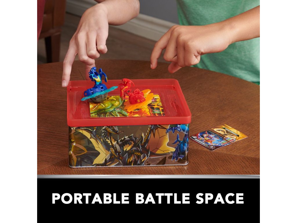 Uložte si sbírku Bakuganů do Baku-tinu, abyste mohli kdykoliv bojovat ve velkém stylu. Na tomto prémiovém kufříku na Bakugany jsou úžasné kresby Bakuganů a patří k němu Mantid Bakugan se speciálním útokem. Tato sada obsahuje také sběratelské karty, například karty postavy, speciálního útoku a brány, spolu s tažným lanem XL, se kterým můžete vyrazit do bitvy se svými oblíbenými bojovníky Bakugan. Když Baku-tin otevřete, získáte dvě vrstvy úložného prostoru pro Bakugany, sběratelské karty a kruhy na speciální útoky, které jsou snadno přístupné a ideální na cesty. Odklopením a překlopením víka si vytvoříte vlastní bitevní prostor, kde můžete kdykoli bojovat. Každá akční figurka Bakugan obsahuje speciální kód, který lze použít v online hře Roblox pro nové způsoby hraní a interakce. Vylepšete si herní strategii pomocí balíčků Bojová aréna a Trénovací balíček (každý se prodává samostatně). Přidejte všechny zbrusu nové hračky Bakugan včetně bitevních a startovních balíčků (každý se prodává samostatně) mezi své oblíbené sběratelské předměty a sestavte si elitní tým. Díky Baku-tinu si domů přinesete dokonalé úložiště hraček pro svou sbírku Bakuganů.Doplňkové parametry