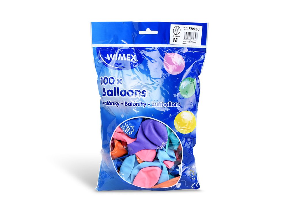 Nafukovací balón s potiskem Happy Birthday. Balení obsahuje 100 ks. Průměr M - 25 cm.Doplňkové parametry