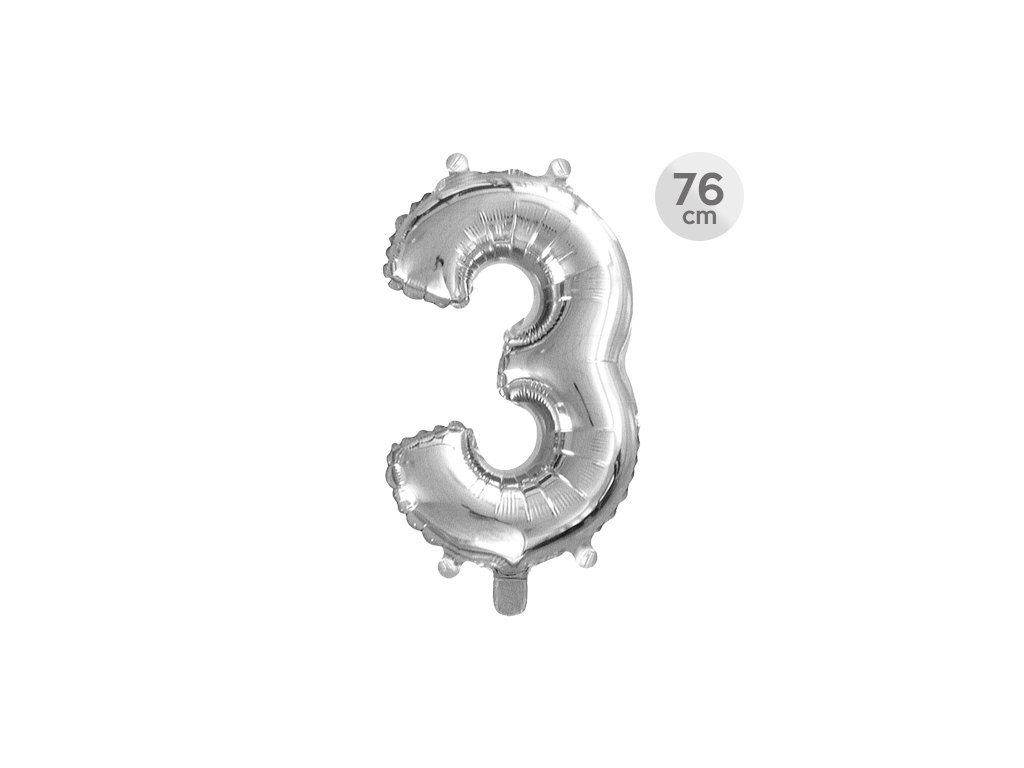Narozeninový balón ve tvaru čísla 3 - stříbrné barvy. Velikost balónu je cca 86 cm. Balón je samotěsnící, takže není nutné vázání. V balení se nenachází brčko na nafouknutí. Na balónu jsou čtyři otvory na zavěšení. Tento fóliový balón je vhodný na nafouknutí héliem nebo vzduchem.Doplňkové parametry