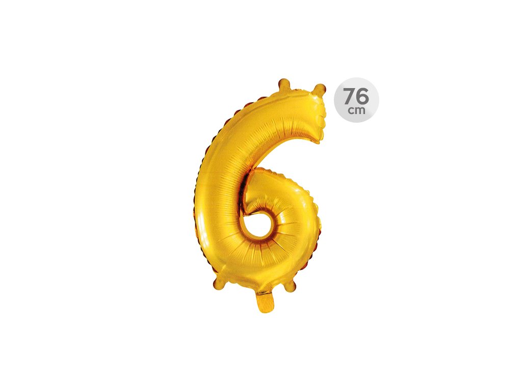 Narozeninový balón ve tvaru čísla 6 - zlaté barvy. Velikost balónu je cca 86 cm. Balón je samotěsnící, takže není nutné vázání. V balení se nenachází brčko na nafouknutí. Na balónu jsou čtyři otvory na zavěšení. Tento fóliový balón je vhodný na nafouknutí héliem nebo vzduchem.Doplňkové parametry