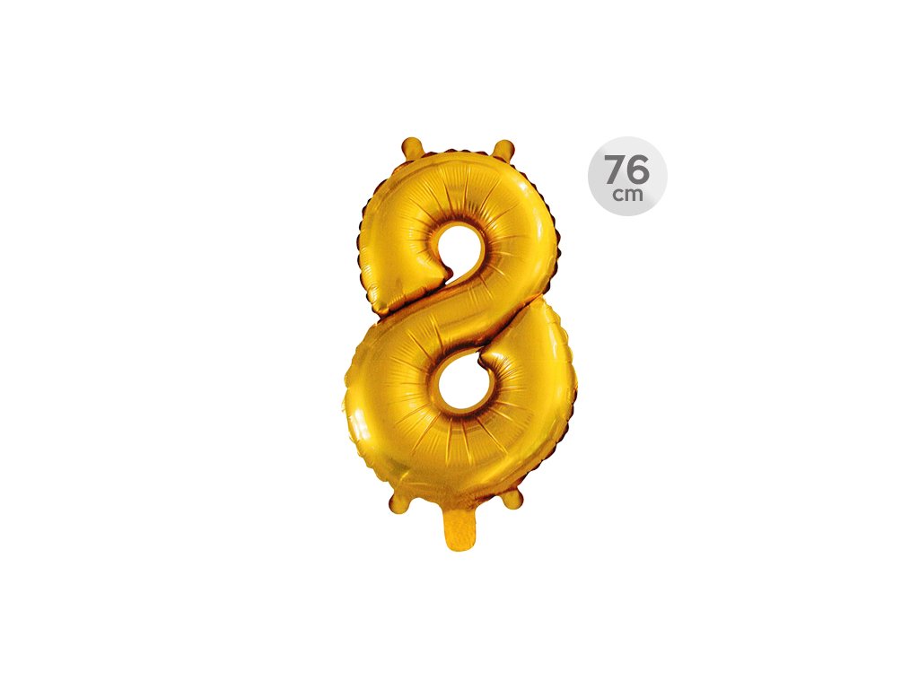 Narozeninový balón ve tvaru čísla 8 - zlaté barvy. Velikost balónu je cca 86 cm. Balón je samotěsnící, takže není nutné vázání. V balení se nenachází brčko na nafouknutí. Na balónu jsou čtyři otvory na zavěšení. Tento fóliový balón je vhodný na nafouknutí héliem nebo vzduchem.Doplňkové parametry