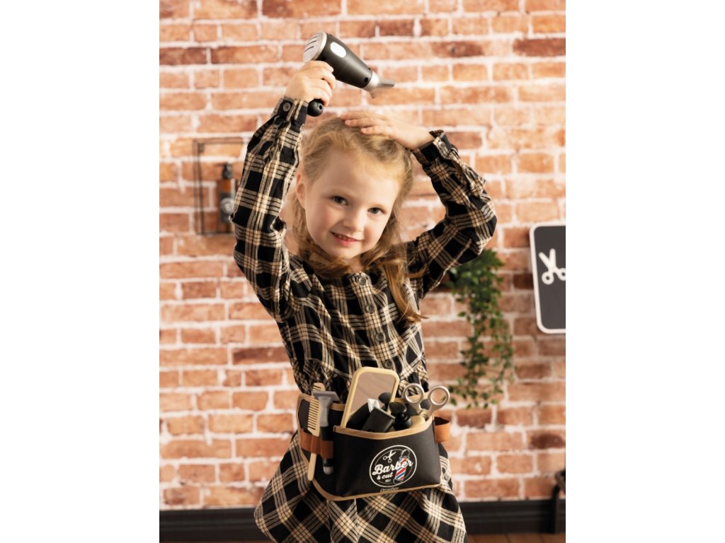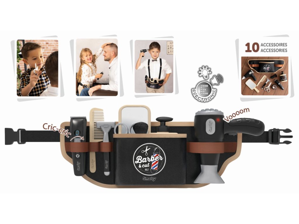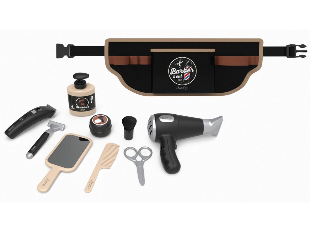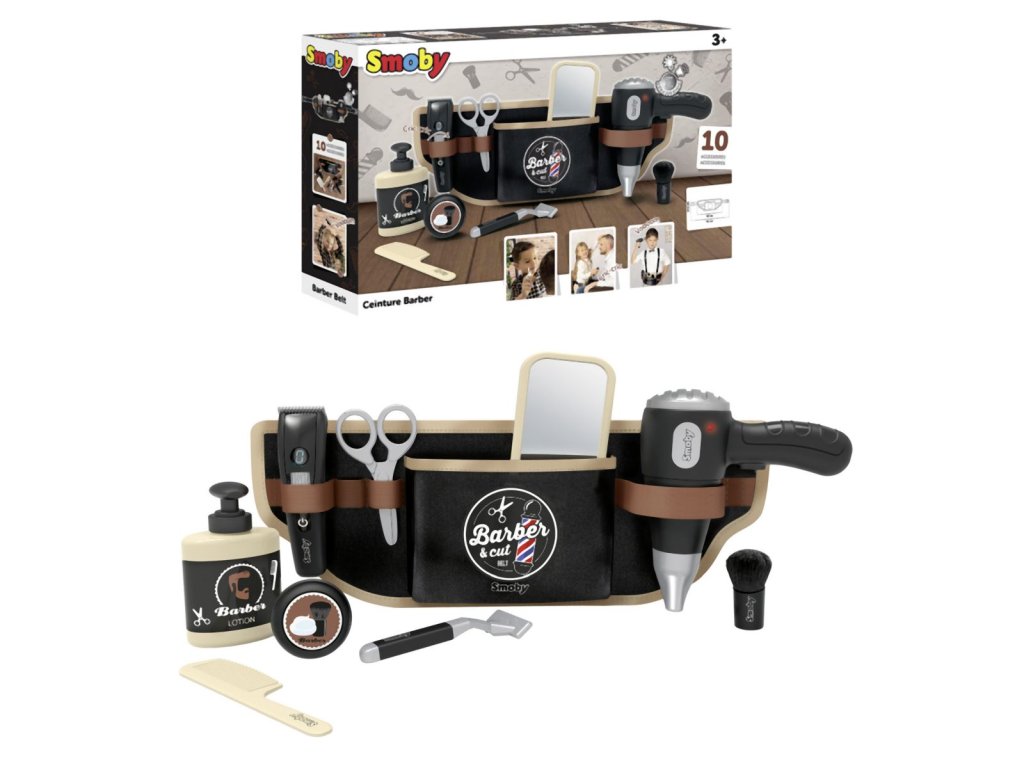 Nastavitelný holičský pás s 10 doplňky. Textilní pásek s nastavitelnou velikostí lze perfektně nastavit a snadno se nasazuje pomocí klipu vhodného pro děti. Gumičky drží deset doplňků: nůžky, mechanický zastřihovač vousů, pleťová voda, holicí strojek, zrcátko, elektronický fén se zvukem, mýdlo na ruce, hřeben a štětka na holení. Rozměry (DxŠxV): 38 x 4 x 14,5 cm.Doplňkové parametry