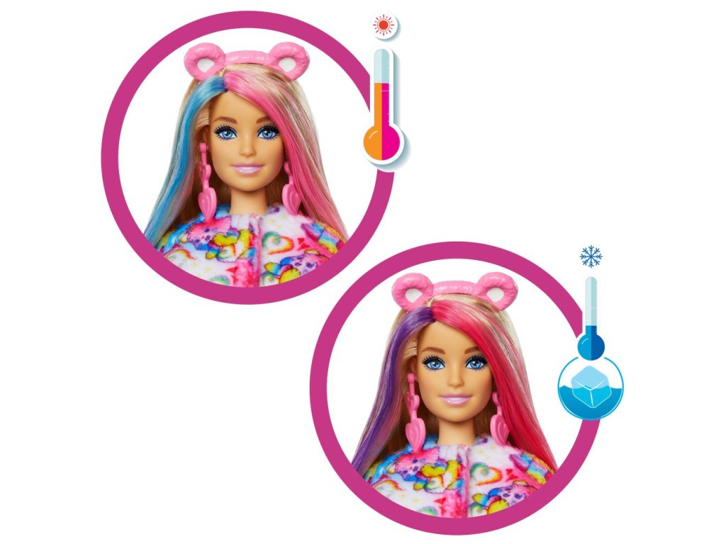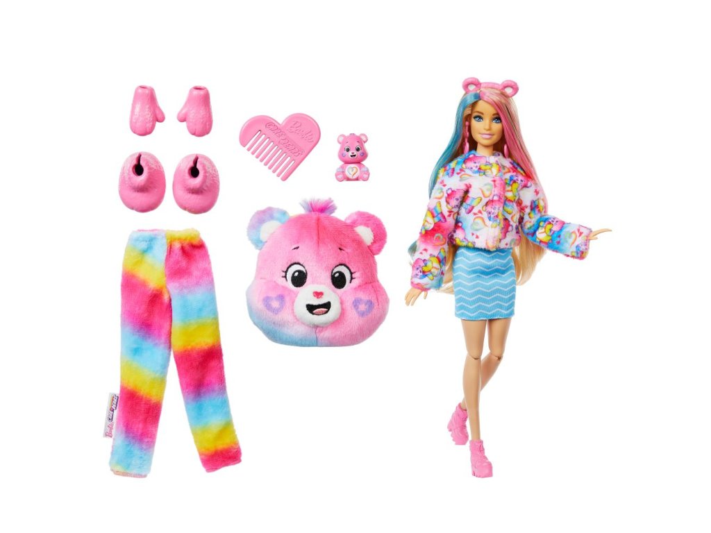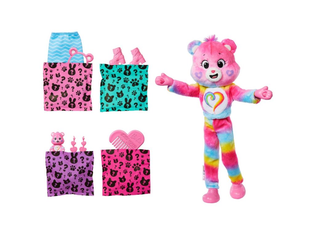 Panenky Barbie Cutie Reveal s motivem Starostlivých medvídků přínáší wow efekt – děti v balení objeví 10 překvapení. V druhé sérii najdou jednu ze tří postaviček Starostlivých medvídků. Po sundání roztomilého plyšového kostýmu se ukáže kloubová panenka Barbie. Kterou odhalíte? Dalšími překvapeními jsou sukýnka, čelenka, náušnice, boty nebo kozačky, houbičko-hřeben a malý plyšový kamarád Starostlivý medvídek. Horní díl kostýmu lze obrátit naruby a použít jako fleecovou bundu, hlavu kostýmu jako pelíšek pro mazlíčka. Pomocí vody zažijete barevnou proměnu na obličeji panenky. Každá panenka se prodává samostatně podle dostupnosti. Panenky samostatně nestojí. Barvy a vzhled výrobku se mohou lišit.Doplňkové parametry