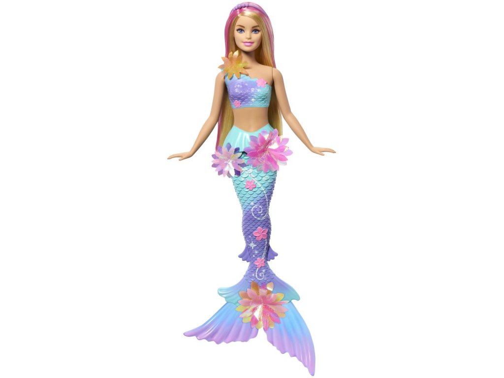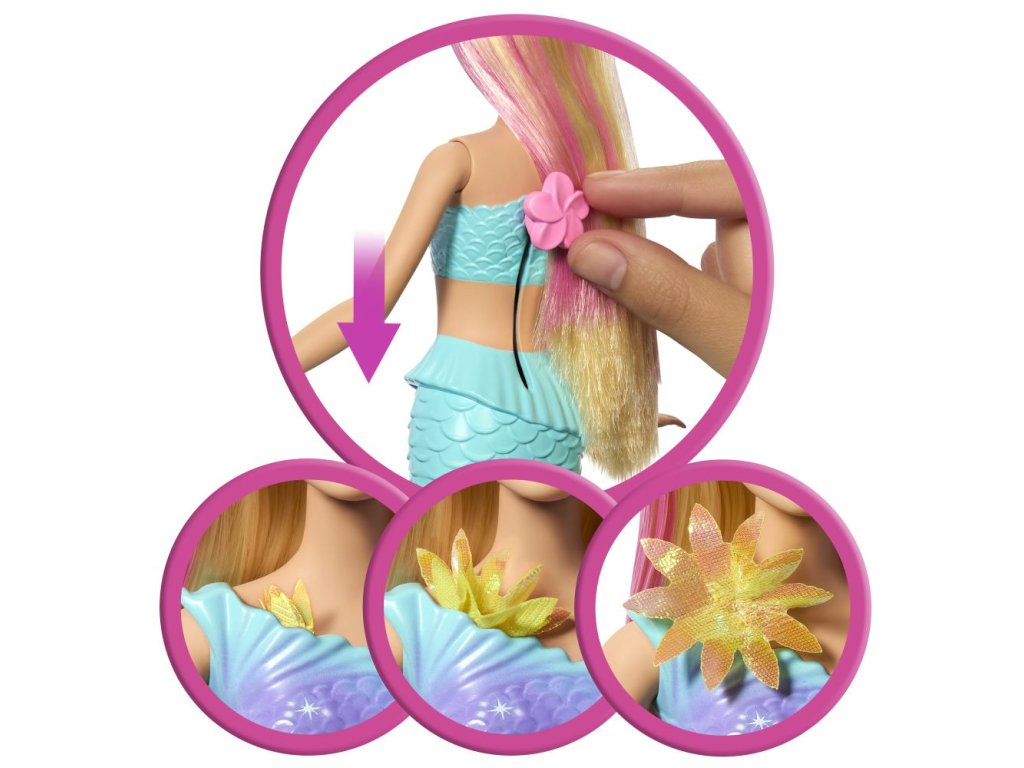 Zažijte zábavu s panenkou Barbie! Posunutím páčky na jejích zádech uvidíte, jak jí květiny kouzelně „rozkvétají“ od živůtku až po její ploutve, a to pořád dokola. Děti si s ní mohou hrát na souši i pod vodou, aby se jim na slunci nebo v moři naskytla nádherná přehlídka květů. S duhovými květy, ombré ploutvemi a doplňkem v podobě perlové čelenky v dlouhých blond vlasech s růžovým melírem - tato panenka Barbie mořská panna je naprosto okouzlující! Panenka nemůže stát ani plavat sama. Barvy a vzhled výrobku se mohou lišit.Doplňkové parametry