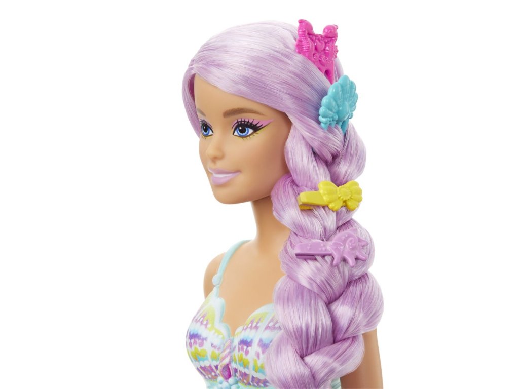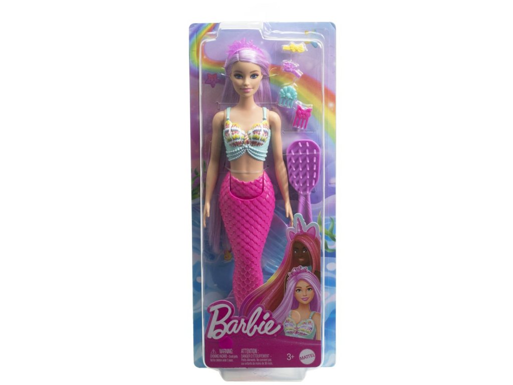 Tato pohádková panenka Barbie® mořská panna má extra dlouhé a pestrobarevné růžové vlasy! Děti si mohou svou mořskou pannu upravit pomocí přiložených vlasových doplňků, pak ji rozčesat a opakovaně si s ní hrát do nekonečna. Pohádkové prvky, jako jsou živůtek inspirovaný oceánem a ombré ocasní ploutve, dodávají této panence Barbie® mimořádný šmrnc. Panenka neumí samostatně stát. Barvy a vzhled výrobku se mohou lišit.Doplňkové parametry