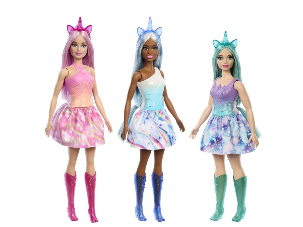 Tyto panenky Barbie® ve stylu jednorožců jsou naprosto kouzelné! Každá panenka Barbie® má na sobě vymodelovaný ombré živůtek s fantastickou sukní s potiskem. Jejich pohádkový vzhled doplňují pestrobarevně zdobené vlasy, čelenky s jednorožčími rohy a ušima, ocasy jednorožců a boty nad kolena! Každá se prodává samostatně, podle dostupnosti. Panenky Barbie® nemohou stát samostatně. Barvy a provedení dekorací se mohou lišit.Doplňkové parametry