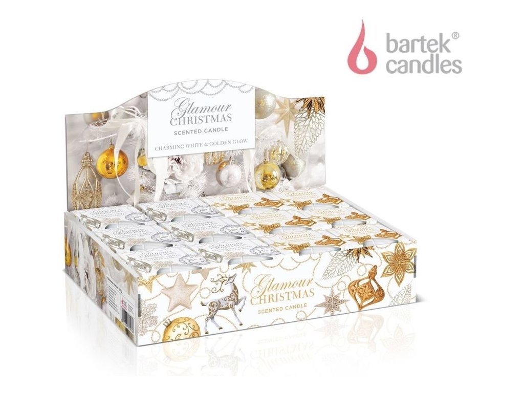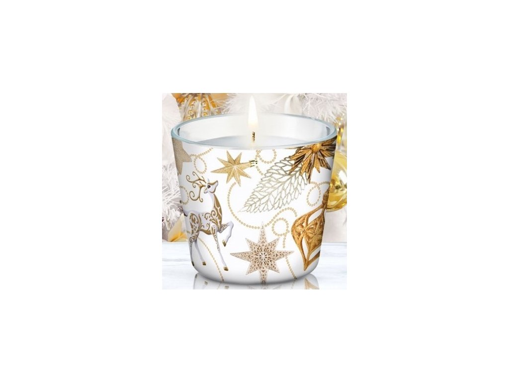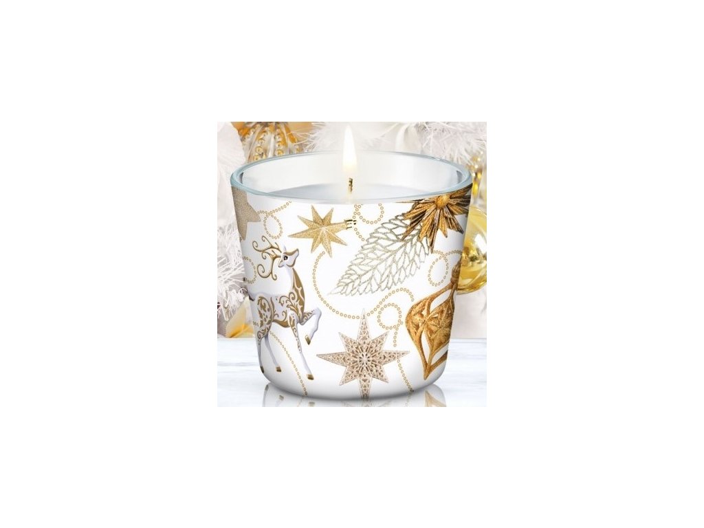 Aromatická dekorativní svíčka s vánočním motivem v konickém skle 115g Glamour Christmas - Charming White s vánoční vůní, rozměry svíčky: průměr 9 x 8,5cm, doba hoření: cca 30 hodin.Balení papírová krabička.Doplňkové parametry