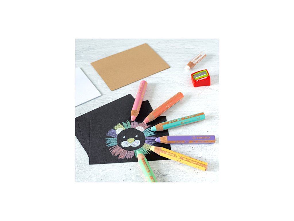 Woody 3 v 1 je farbička, vodovka a voskovka v jednom, ktorá vie kresliť na papier, na tmavý podklad, kartón, sklo, kov, drevo alebo trebárs aj na gumáky. Ozdobiť si drevený rámik, okno, chlebník alebo plechovku na ceruzky je hračka. Deti ju milujú a rodičia môžu zostať v pokoji, pretože farbu možno z ručičiek aj z hladkého povrchu dobre zmyť vodou s mydlom alebo saponátom. Tuha obsahuje osemkrát viac farby než bežná farbička, nemožno ju zlomiť a hodí sa na extra dllllllllhé kreslenie a na veľké umelecké diela: vďaka hrubej tuhe je možné všetko rýchlo vyfarbiť. Vďaka svojmu tvaru padne woody výborne do detskej ručičky. K dostaniu je 18 atraktívnych farieb, vrátane zlatej a striebornej. Zakúpiť sa dá v baleniach alebo jednotlivo. K dispozícii je aj špeciálne strúhadlo.Doplňkové parametry