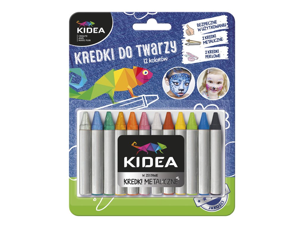Sada obsahuje 12 pastelek, z toho 2 metalické – zlatá a stříbrná a 2 perleťové – modrá a růžová. Pastelky mají intenzivní barvy a jsou jemné, díky čemuž se velmi lehce kreslí na pokožku. Tužky jsou bezpečné pro používání díky dermatologickým testům.Doplňkové parametry